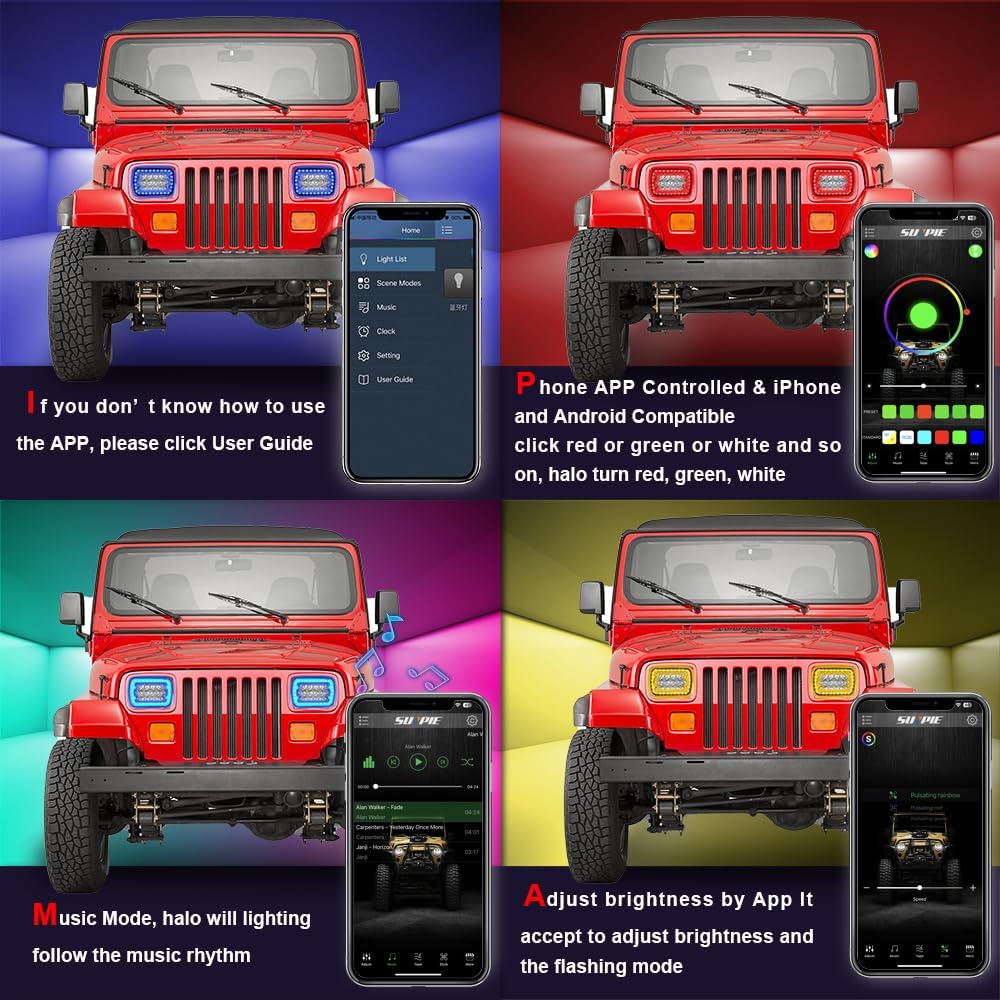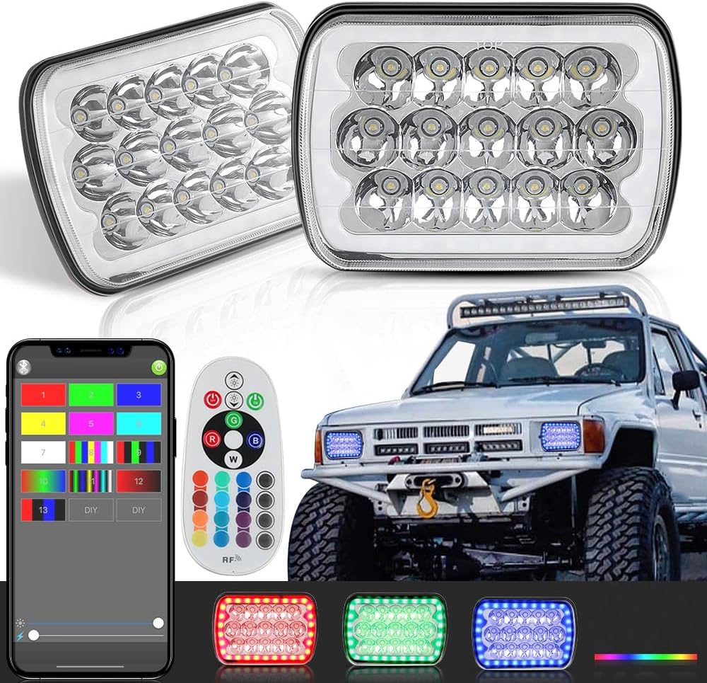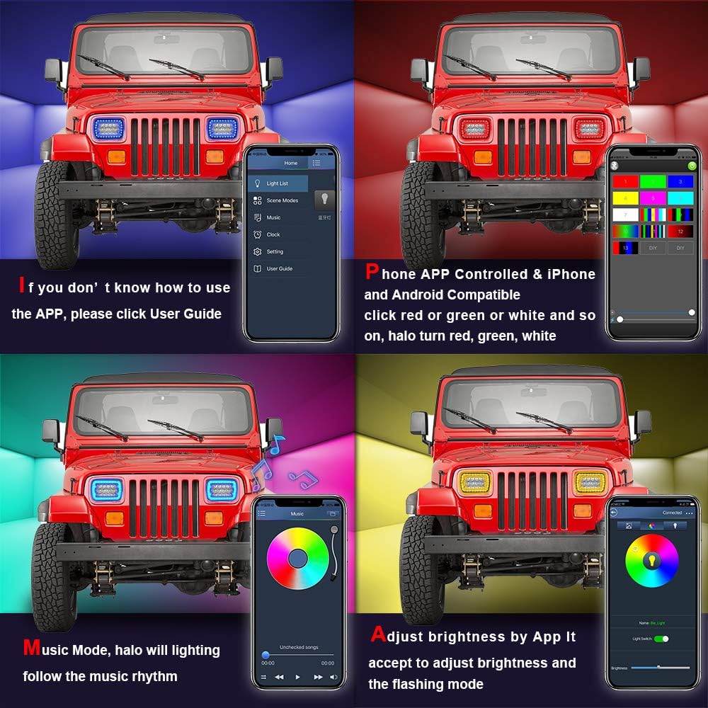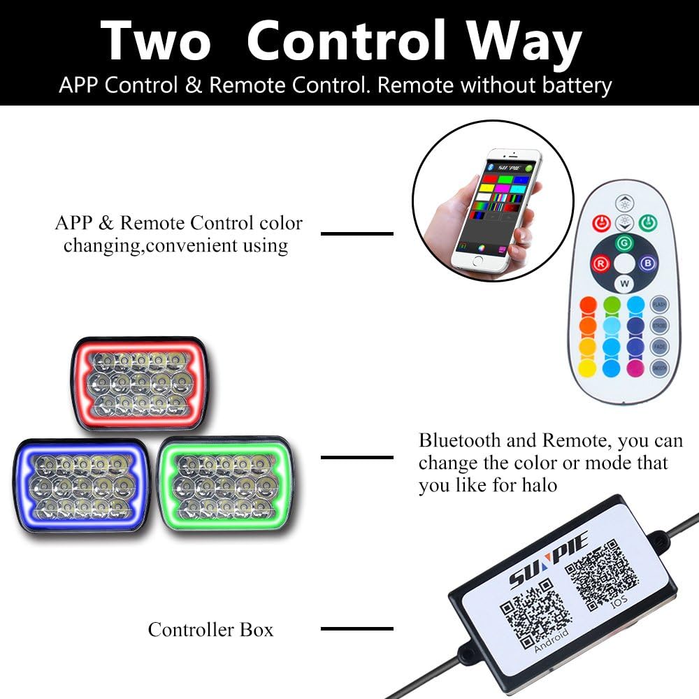 التحكم في التطبيق، المزامنة مع الموسيقى: يأتي المصباح الأمامي SUNPIE 5x7 LED RGB مع هالات متعددة الألوان ومتعددة التأثيرات تمنح شاحنتك مظهرًا مخصصًا. يمكنك التحكم في المصابيح الأمامية عبر تطبيق أو جهاز تحكم عن بعد، وتأتي العبوة مع وحدة تحكم بلوتوث توفر التحكم في التطبيق. تحتوي المصابيح الأمامية أيضًا على وظيفة المزامنة مع الموسيقى والفلاش ومئات الأوضاع للاختيار من بينها. يمكنك حتى تخصيص اللون والوضع.