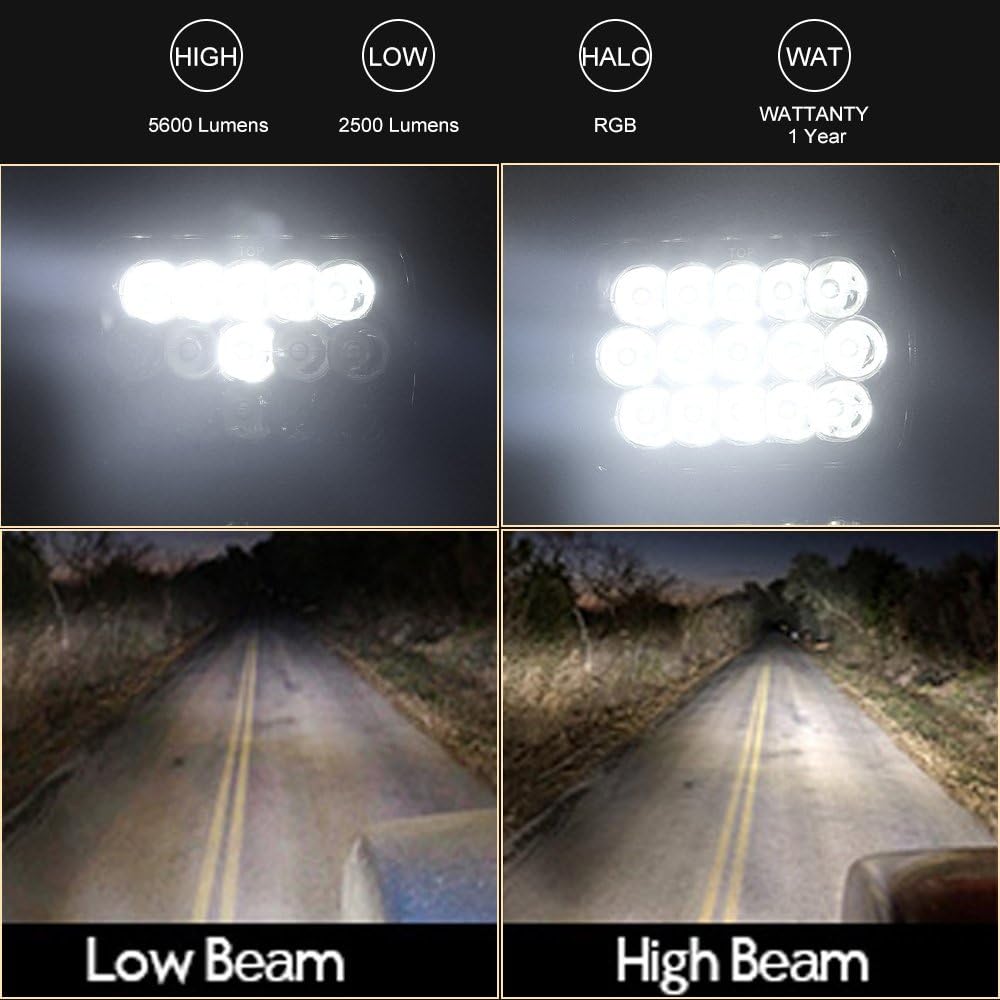 أكثر إشراقًا ورائعة: تحتوي المصابيح الأمامية LED 5x7 RGB على شريحة LED ساطعة مدمجة مع درجة حرارة لون 80 وات و6000 كلفن. تحتوي المصابيح الأمامية على خيارات الشعاع العالي والمنخفض، مع 15 شريحة LED عند تشغيل الضوء العالي و6 شرائح LED عند تشغيل الضوء المنخفض. بالإضافة إلى ذلك، فإن ميزة تغيير اللون تمنح سيارتك مظهرًا عصريًا.
