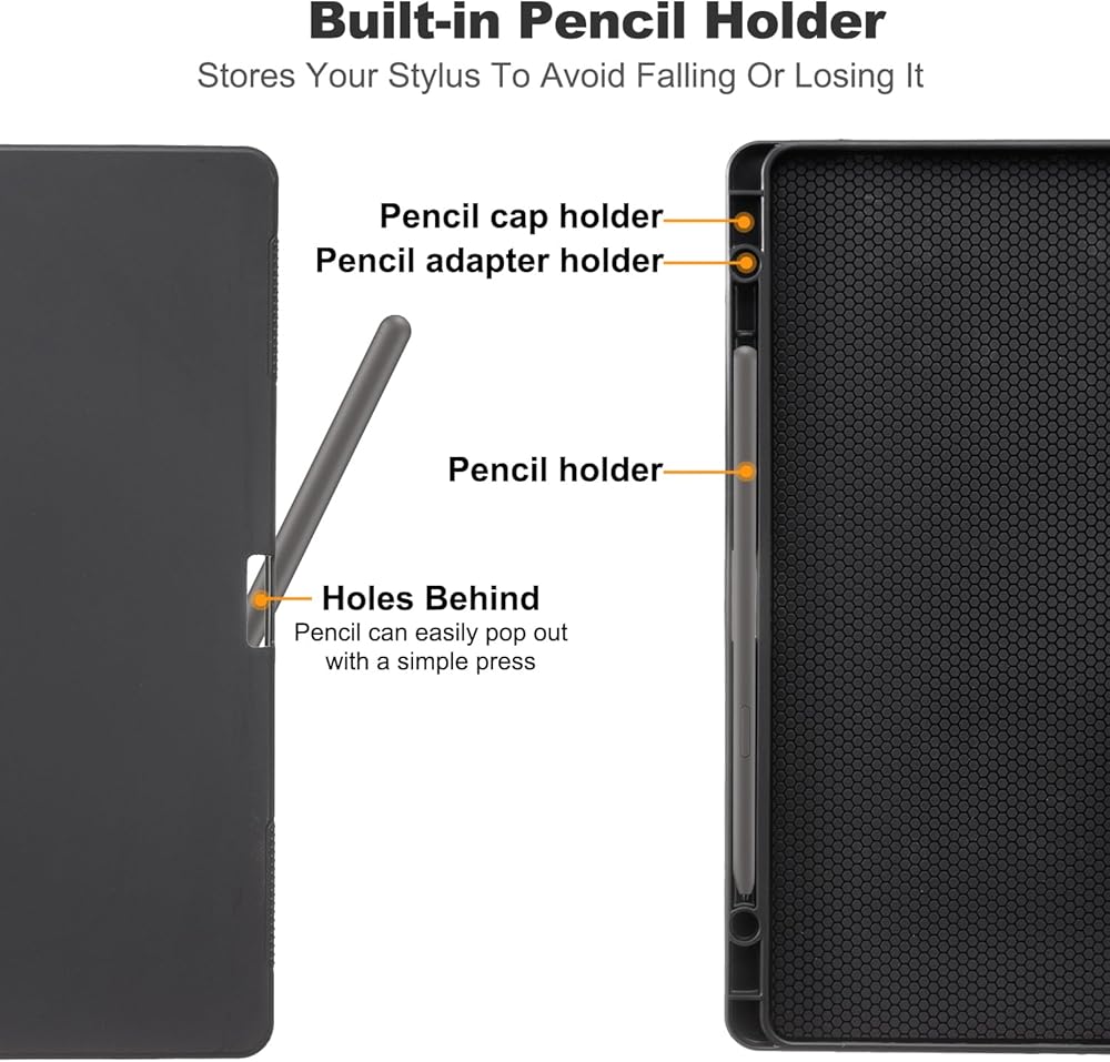 Built-In Pen Holder And Multi-Angle Standing: Built-In Pencil Holder That Holds Your Stylus Pen Firmly In Place To Avoid Falling Or Missing. Three Non-Slip Groove Designs Can Adjust The Tablet To Different Viewing Angles While Increasing The Stability When Operating The Tablet, So That The Device Does Not Slip Easily.