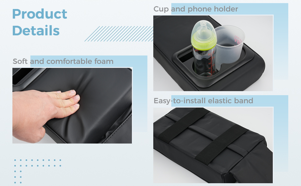 【تركيب بدون متاعب】تم تصميم مسند الذراع الخاص بنا بأشرطة مرنة مرنة، ويمكن تثبيته بسهولة على وحدة التحكم المركزية في غضون ثوانٍ. لا الأدوات المطلوبة! يحمل حامل الأكواب والهاتف مشروبك وكوب الماء والعملات المعدنية والبطاقات المصرفية وغيرها من الأشياء الصغيرة بشكل مريح، مما يوفر وصولاً سريعًا وسهلاً أثناء القيادة.