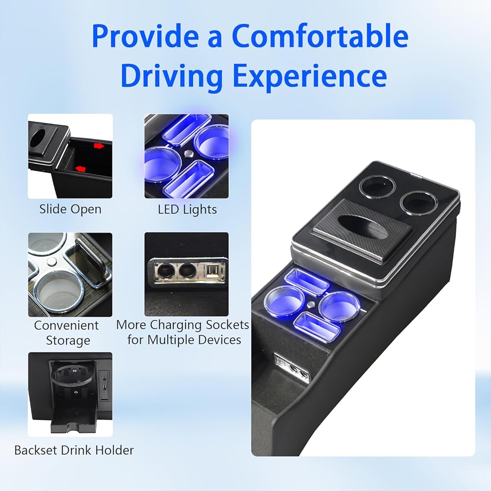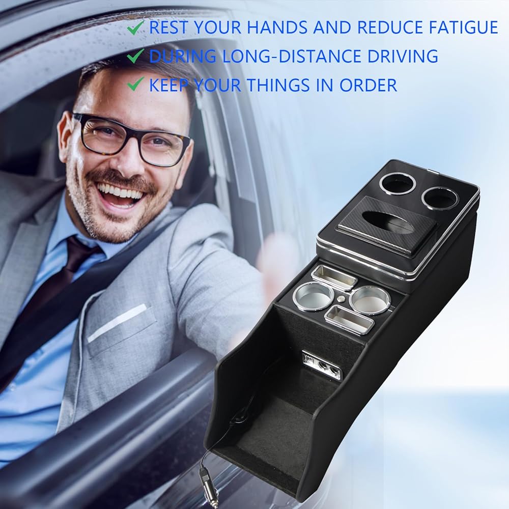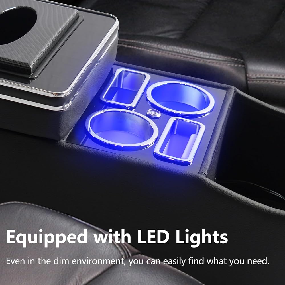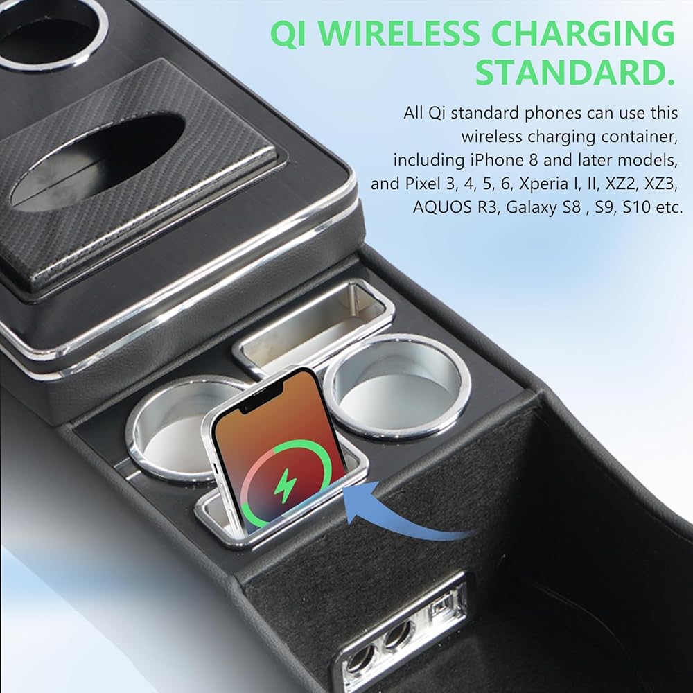 【متعدد الوظائف】صندوق وحدة التحكم المركزية للسيارة متعدد الوظائف. يحتوي على حاوية شحن لاسلكية متوافقة مع معيار الشحن اللاسلكي Qi. يمكن لجميع هواتف Qi القياسية استخدام حاوية الشحن اللاسلكي هذه. ويتم أيضًا تضمين الوظائف الأخرى الأساسية للقيادة المريحة، مثل حاملات الأكواب، ومصابيح LED، ومنافذ USB، ولاعات السجائر.