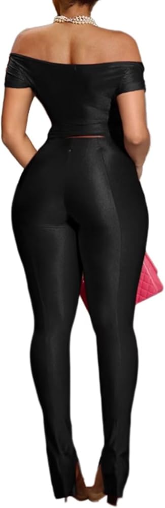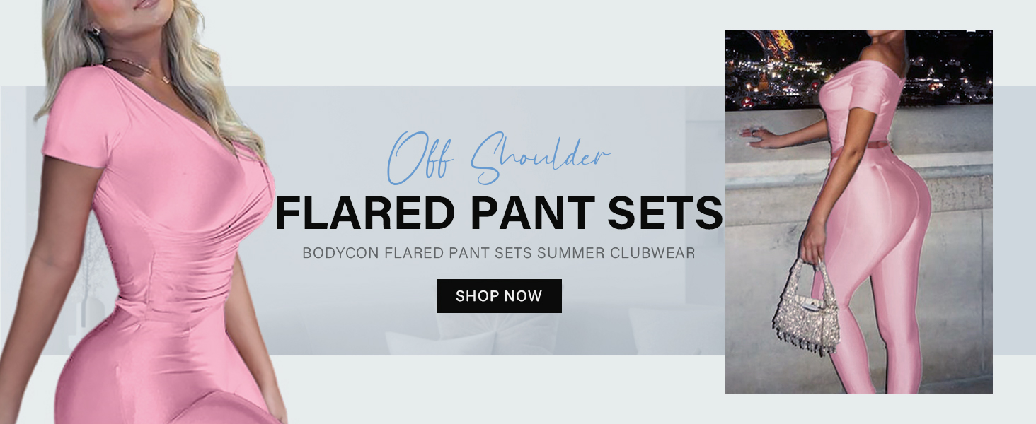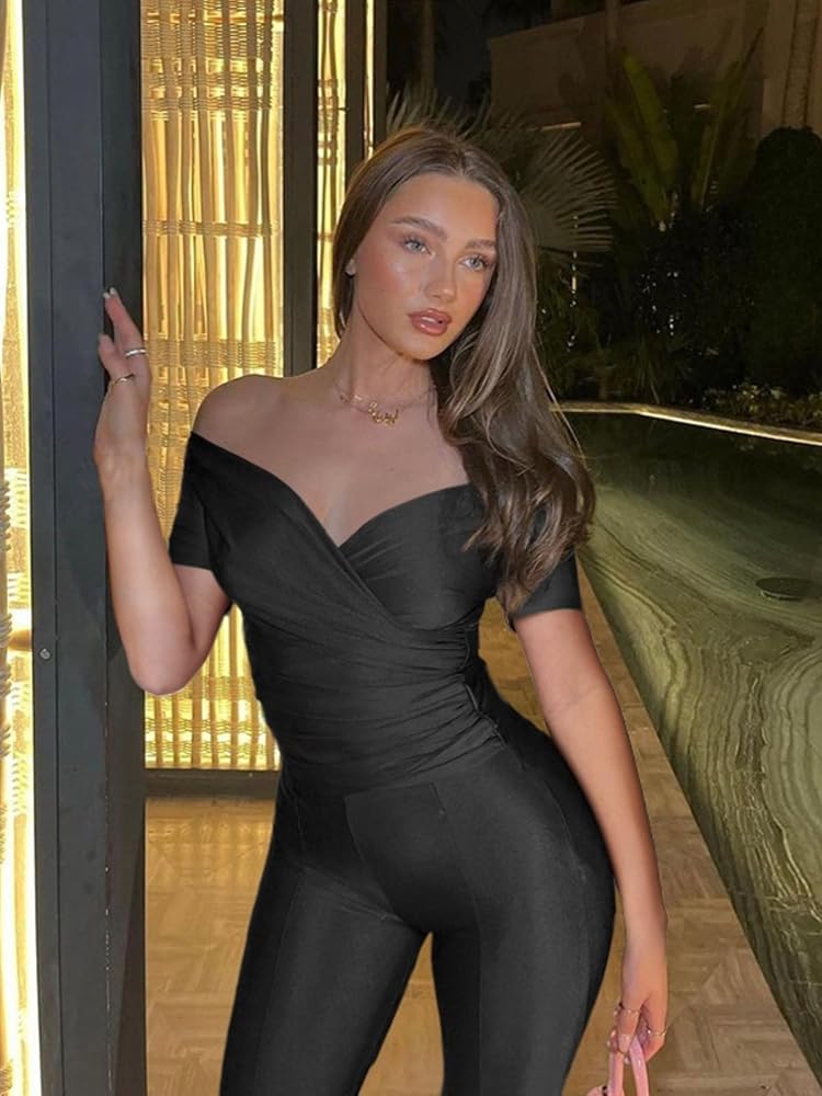 Feature: Two Piece Outfits for Women,Solid Color 2 Piece Outfits for Women/ Off Shoulder Wrap V-Neck / Unique Ruched Crop Tops / Elastic Waist Flared Pants/