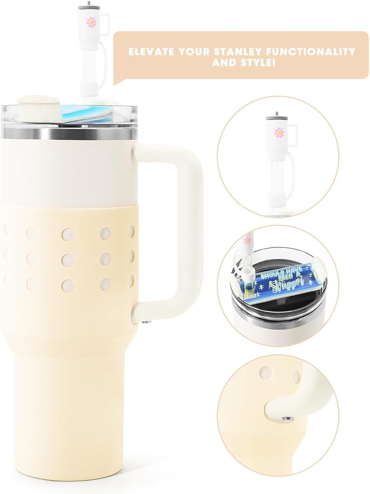 • Cute Silicone Straw Cover: Comes with a cute cup shaped straw lid, size caliber is 8-10mm, diameter is 0.4 inches, perfectly compatible with Stanley and other mainstream brands of 40oz straw diameter water bottles, its firm fit prevents accidental dislodgement, keeps the straws clean and dirt free BPA free, safe and odorless. It also comes with a very useful lipstick organizer!