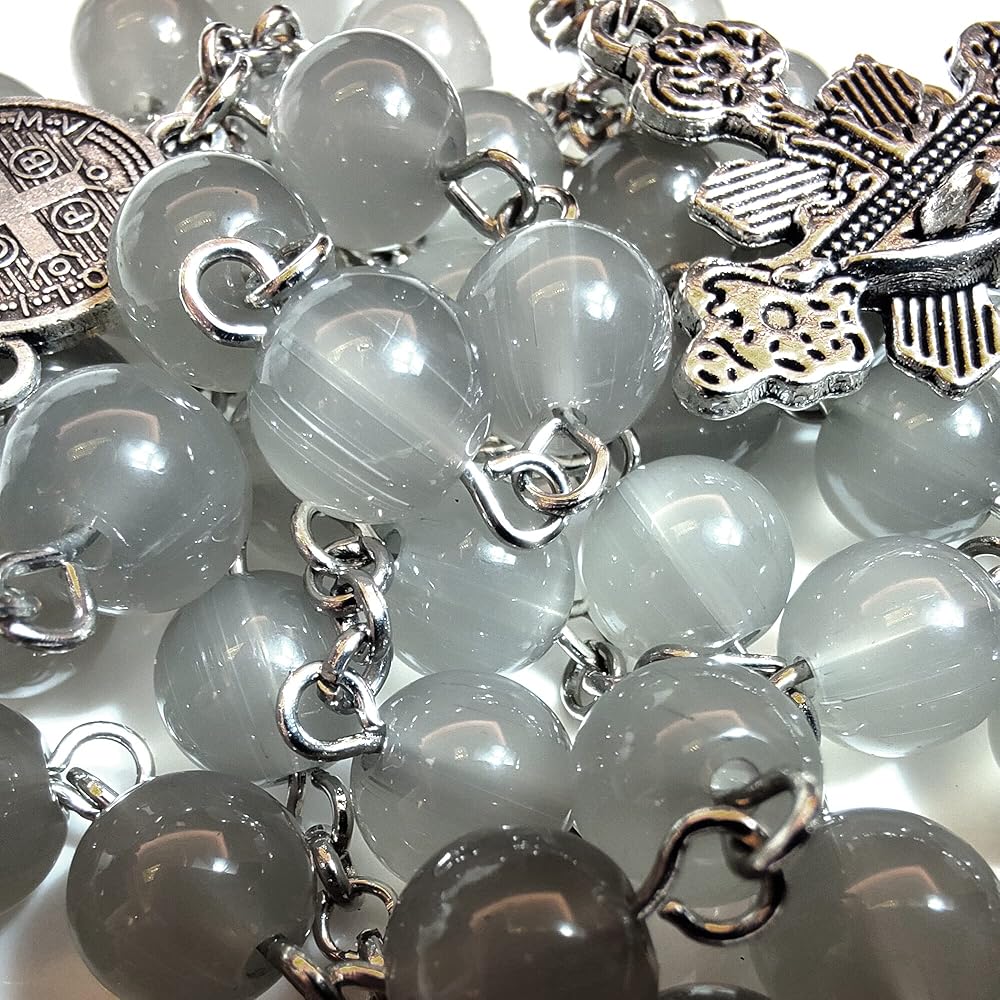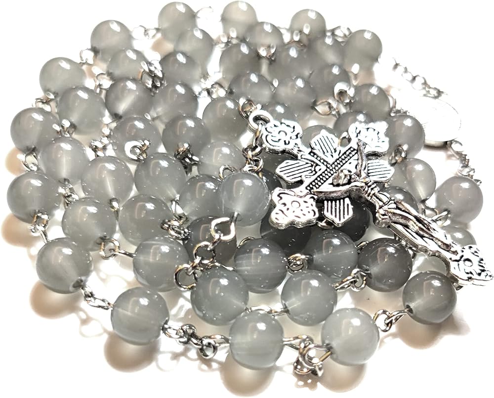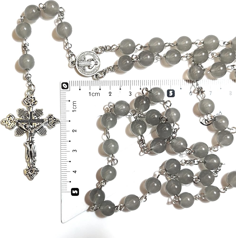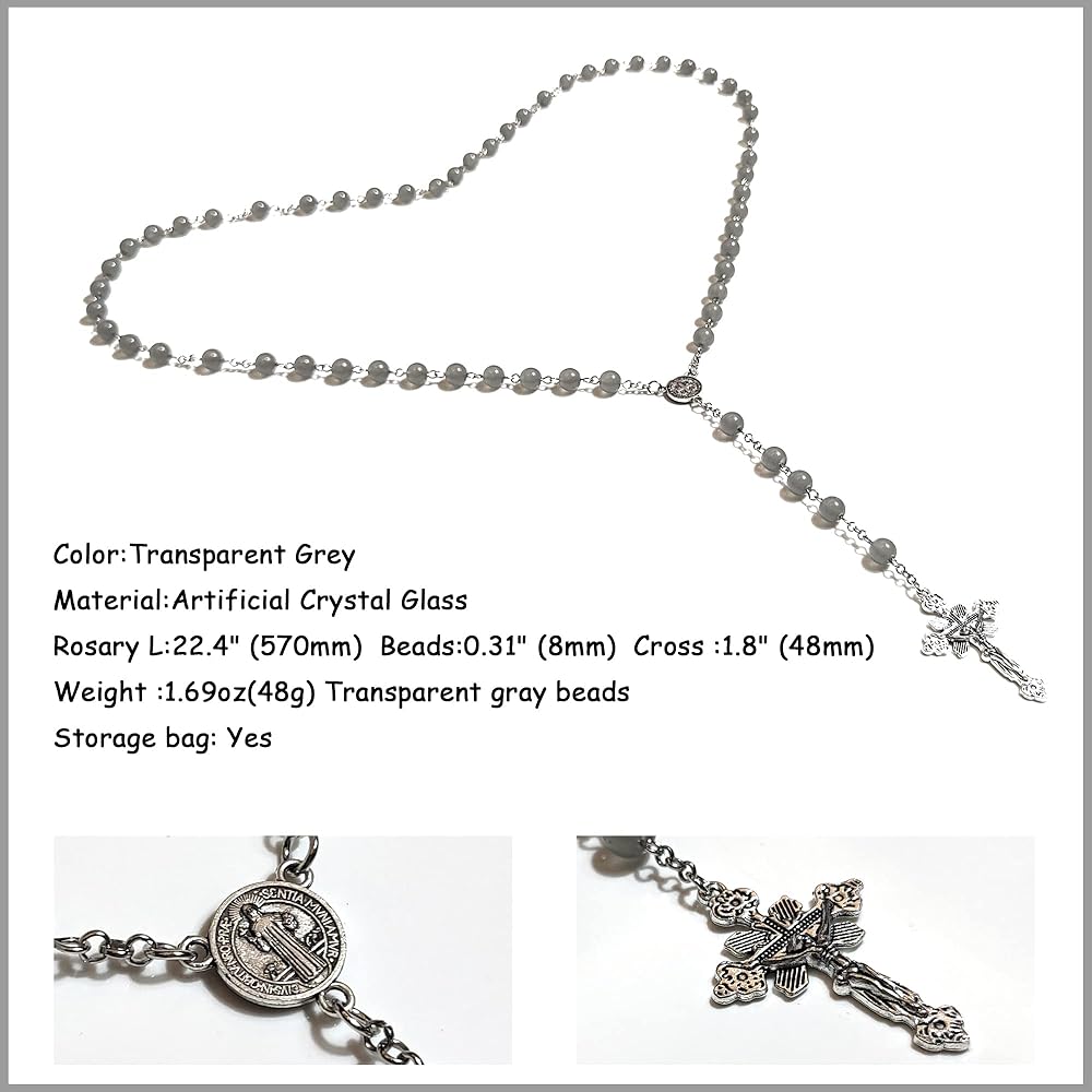 • Color:Grey Material:Artificial Crystal Glass Rosary L:22.4" (570mm) Beads:0.31" (8mm) Cross :1.8" (48mm) Weight :1.69oz(48g) Customized gray beads