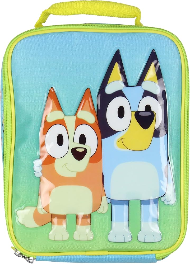 Lunch Box- Constructed from durable materials, this lunch bag is designed to withstand the hustle and bustle of school life, picnics, and day trips. It showcases a raised character design of Bluey and Bingo