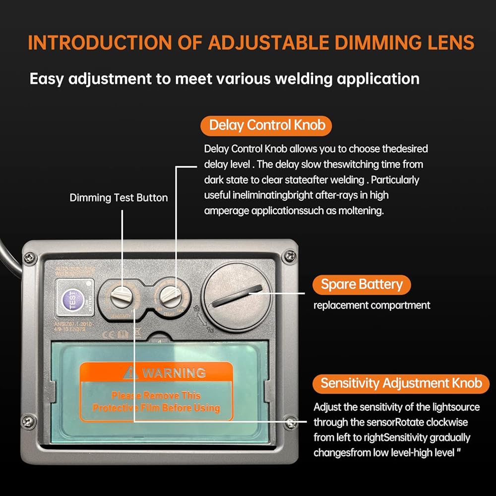 التعديل اليدوي يلبي المتطلبات المختلفة: مجهز بإعدادات الحساسية والتأخير من أجل القدرة على التكيف مع البيئات المختلفة وفترات المهام؛ استمتع برؤية محسنة والتعرف على الألوان. مستوى ضوء الفلتر هو DIN4 والوقت من الحالة المظلمة إلى الحالة الساطعة خلال 0.1 ثانية إلى 1.0 ثانية.