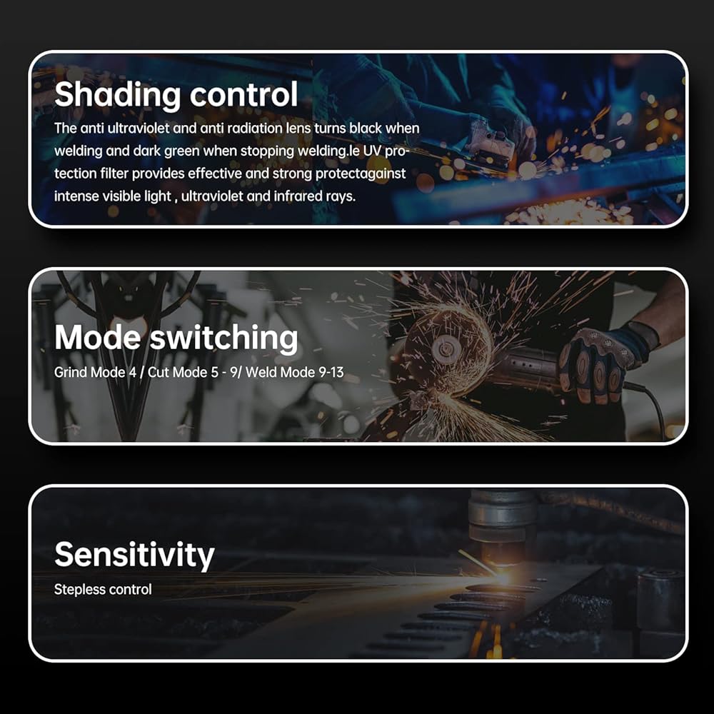 حماية العين: يعمل فلتر التعتيم التلقائي على تشغيل لحظة ظهور قوس الكهرباء، مع مبدأ الكهروضوئية. يمكن تعديل درجة الظلام بين DIN 9 و13، وهو اختيار ذكي للسلامة.