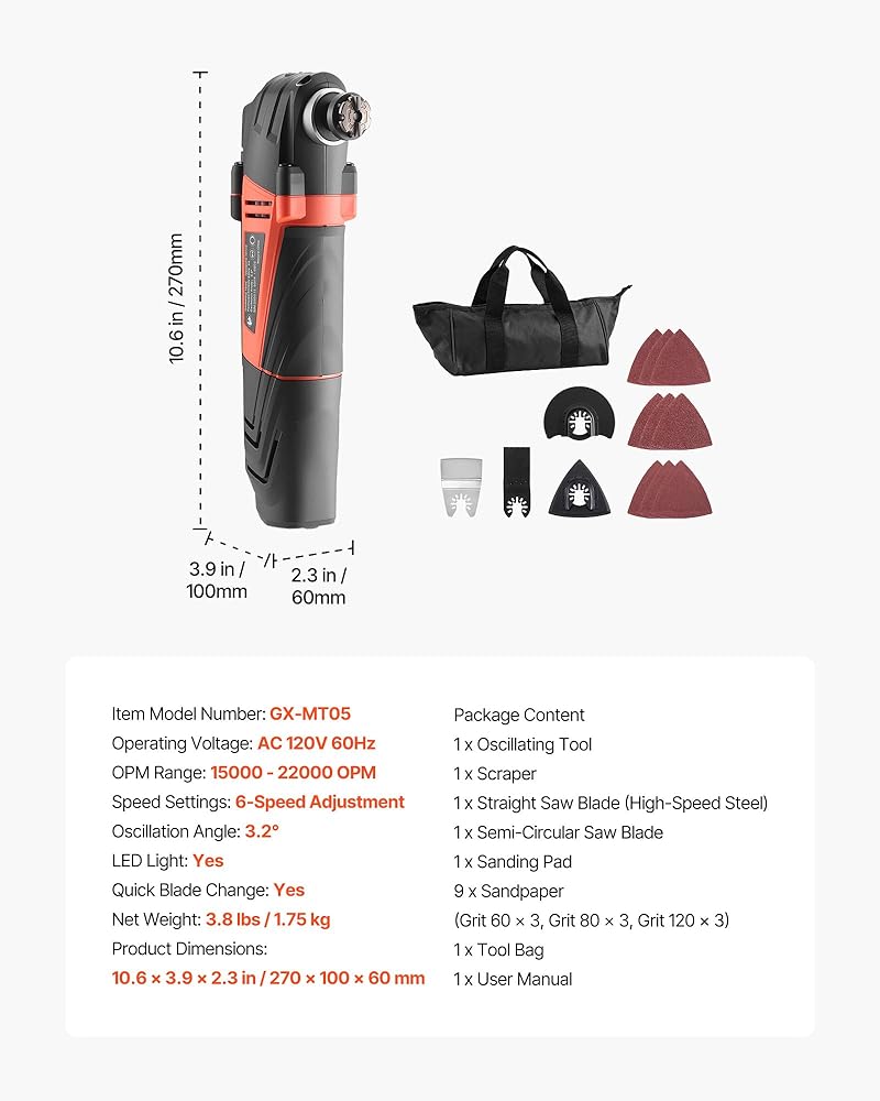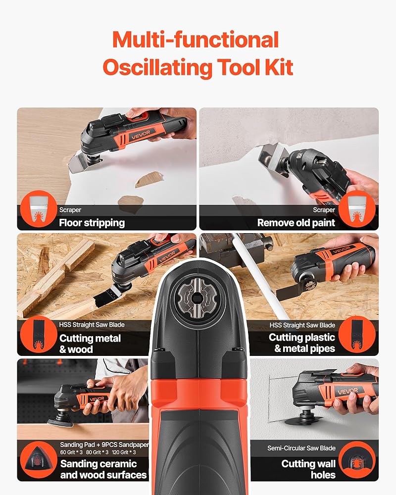 احصل على المزيد من العمل بسهولة: أداتنا المتأرجحة متعددة الأدوات هي الإضافة المثالية لمجموعة أدواتك، فهي مجهزة بشفرة منشار خشبية/بلاستيكية، وشفرتين منشار خشب (فولاذ عالي الكربون)، وشفرة منشار نصف دائرية، وكاشطة مرنة، وصنفرة. وسادة، و10 قطع من ورق الصنفرة. يمكن استخدام هذه الأداة الكهربائية المحمولة ومتعددة الاستخدامات في الصنفرة والقطع والكشط والطحن والتلميع، مما يجعل من السهل عليك إنشاء تحف فنية بنفسك!
