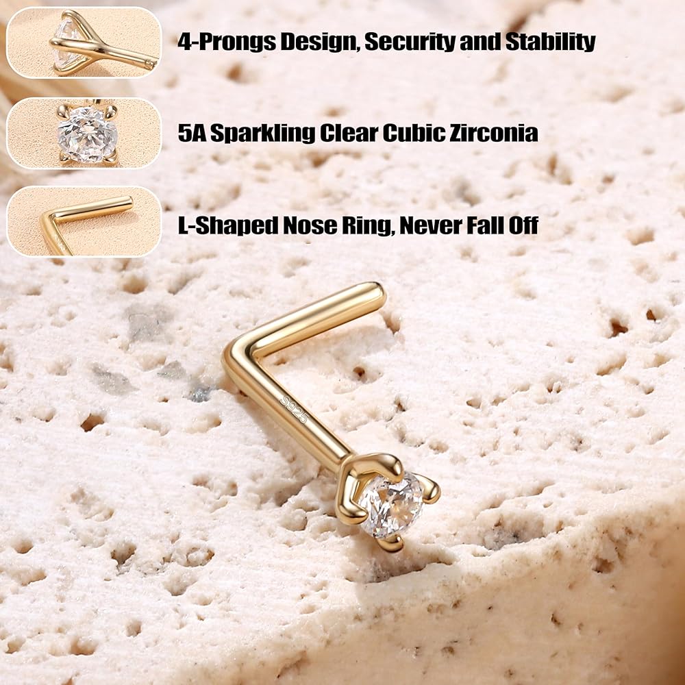 🌟【مواصفات حلقة الأنف】: قياس حلقة الأنف الذهبية على شكل حرف L: طول عمود يمكن ارتداؤه 7 مم، تصميم ذو 4 شوكات يحمل بإحكام ألماس مقلد صغير مبهر 3 مم 5A زركونيا مكعب. سمك القضيب 18 قياس (1.0 مم)، يمكن استخدامه كحلقات شفاه، وثقب للأنف، وثقب للأنف - مسمار أنف متعدد الاستخدامات
