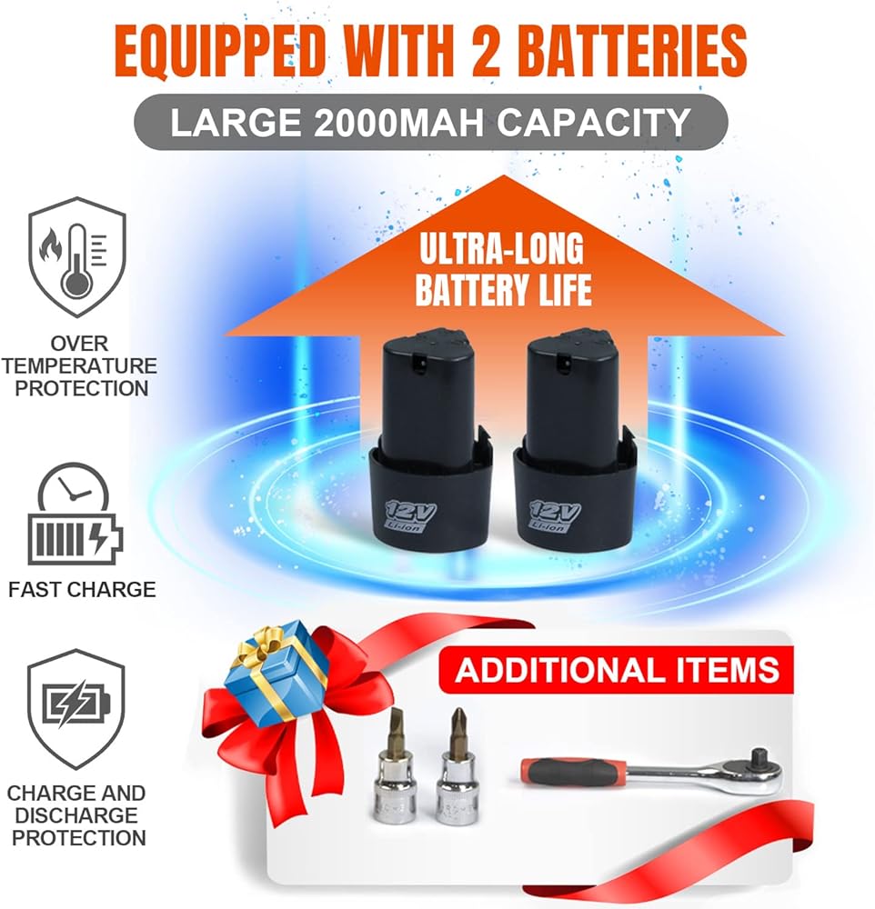🧰مجموعة مفاتيح السقاطة الكاملة تأتي مجموعة مفاتيح السقاطة الفاخرة هذه مع بطاريتين 12 فولت 2.0 أمبير MJF مع 1000 دورة شحن، وشاحن سريع لمدة 60 دقيقة، وحقيبة بلاستيكية، و12 مقبسًا، ودليل الاستخدام. احصل على كل ما تحتاجه في مجموعة واحدة مناسبة.