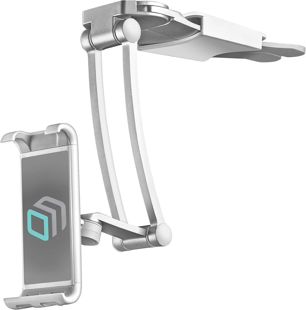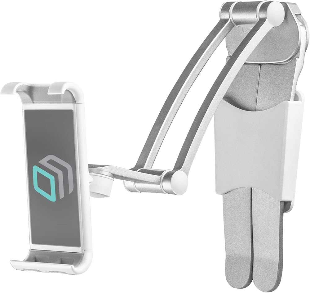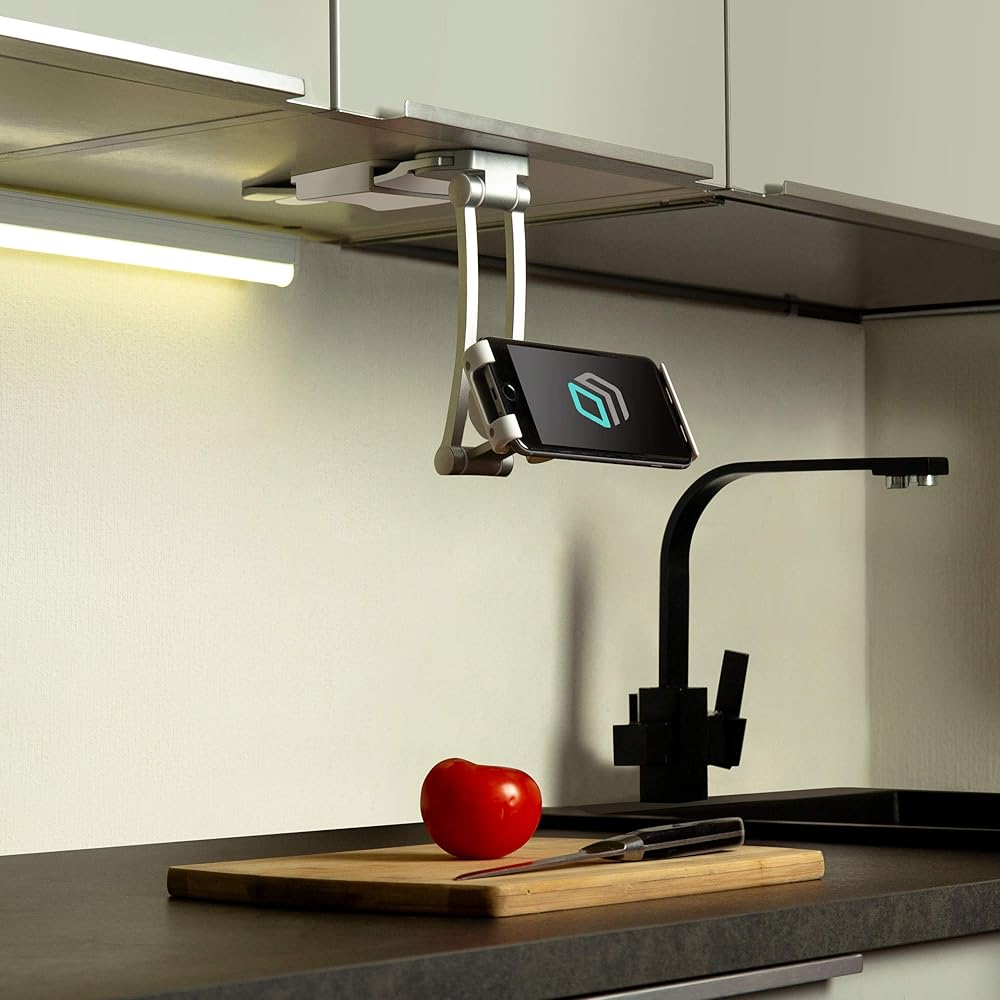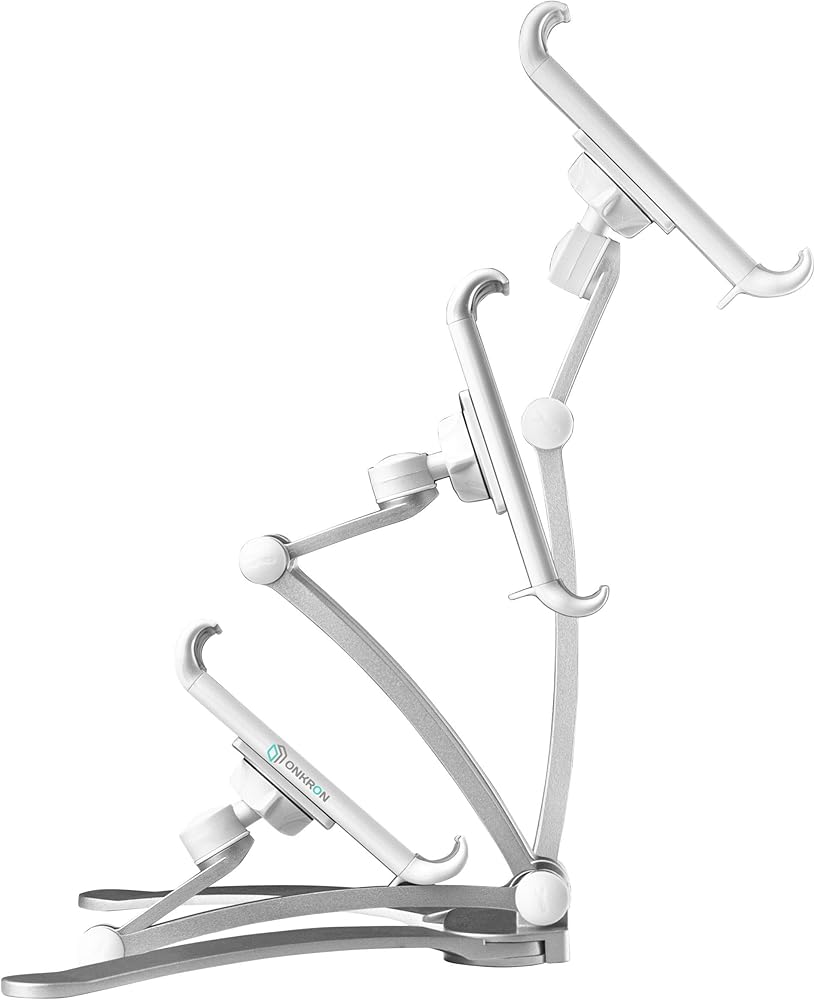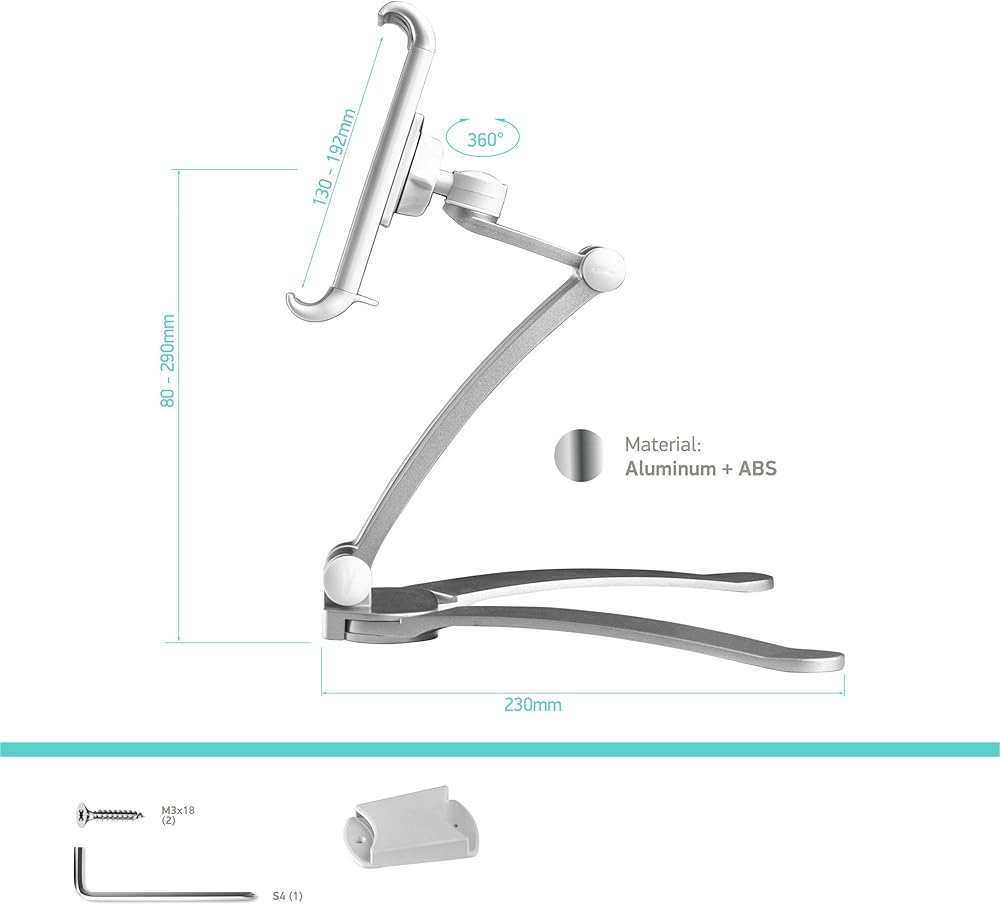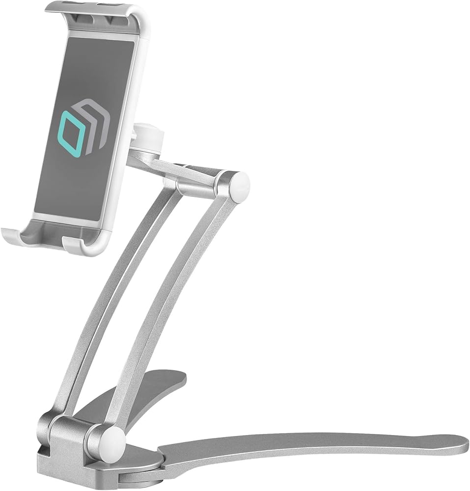 Universal cell phone stand and tablet holder DS-01 by ONKRON is a new solution for all your devices, including your smartphones, tablets and E-Books with screen diagonal for 4.7” to 11-Inch. Light but sturdy aluminum construction is designed for devices weighting up to 2.4 pounds. It perfectly fits all modern devices such as iPhone / iPad and all Android smartphones, and tablets. With this holder you can free your hands and enjoy your favorite TV show with maximum comfort. DS-01 is fully adjustable and has 360° swiveling, 360° tilting, and 180° screen rotation. The mounting of the stand has adjustable width from 6.2” up to 16.1”. The main feature of this model – it has three ways of installation: traditional standing on a desk, can be attached to a wall or even upside down on horizontal surfaces!