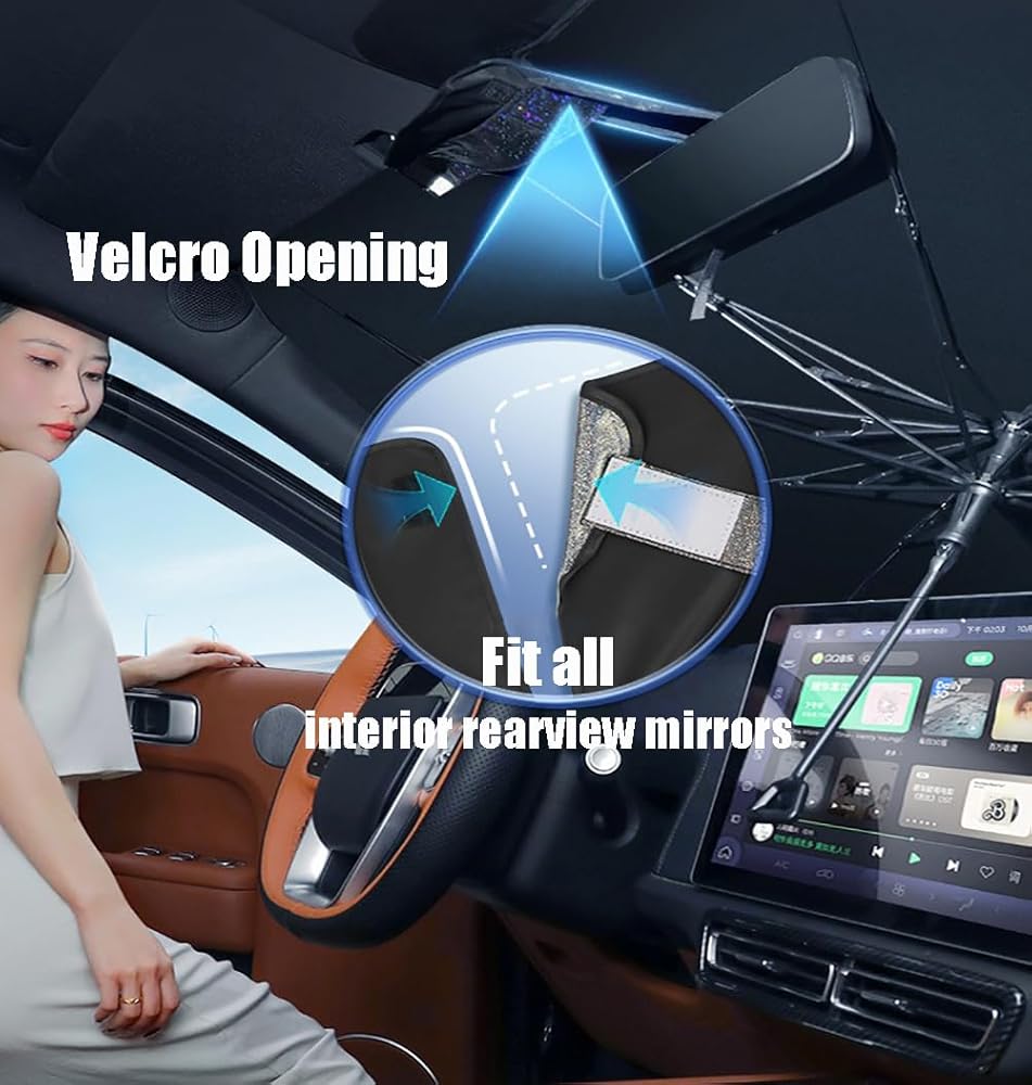 【تصميم فيلكرو محسن للتهوية】في موضع مرآة الرؤية الخلفية الداخلية، قمنا بتصميم فتحة فيلكرو على حافة المظلة، والتي يمكن أن تناسب تمامًا جميع أنواع مرايا الرؤية الخلفية الداخلية، تصميم حقيقي لظل الشمس.