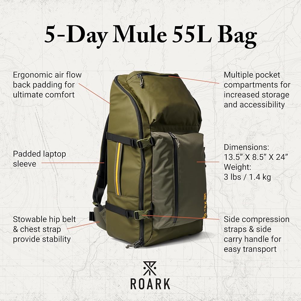 حقيبة ظهر متعددة الأغراض لمدة 5 أيام: تتميز حقيبة Roark متعددة الأغراض بأنها تزيد من مساحة التخزين وسهولة الوصول مع توفير الثبات من خلال حزام الورك القابل للتخزين. أمسك بمقبض الحمل عند البحث عن طريق خروج أو للحاق برحلتك القادمة