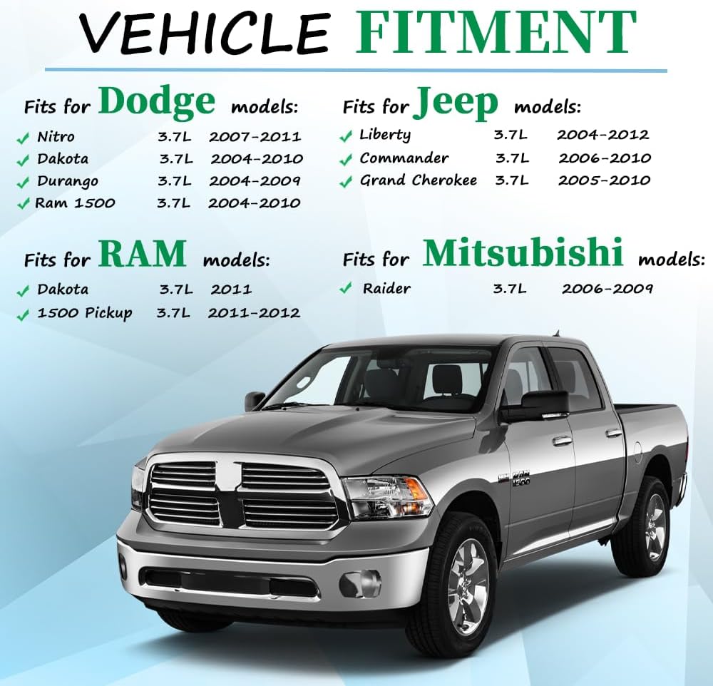 • 【الإعداد】- متوافق مع دودج نيترو 3.7L 2007-2011، داكوتا 3.7L 2004-2010، دورانجو 3.7L 2004-2009، رام 1500 3.7L 2004-2010. متوافق مع جيب ليبرتي 3.7L 2004-2012، كوماندر 3.7L 2006-2010، جراند شيروكي 3.7L 2005-2010. متوافق مع ميتسوبيشي رايدر 3.7L 2006-2009. متوافق مع رام داكوتا 3.7L 2011، 1500 بيك اب 3.7L 2011-2012.
