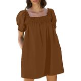 - فستان فضفاض لطيف يتميز بأكمام منتفخة وتفاصيل مطوية وجيوب جانبية مريحة