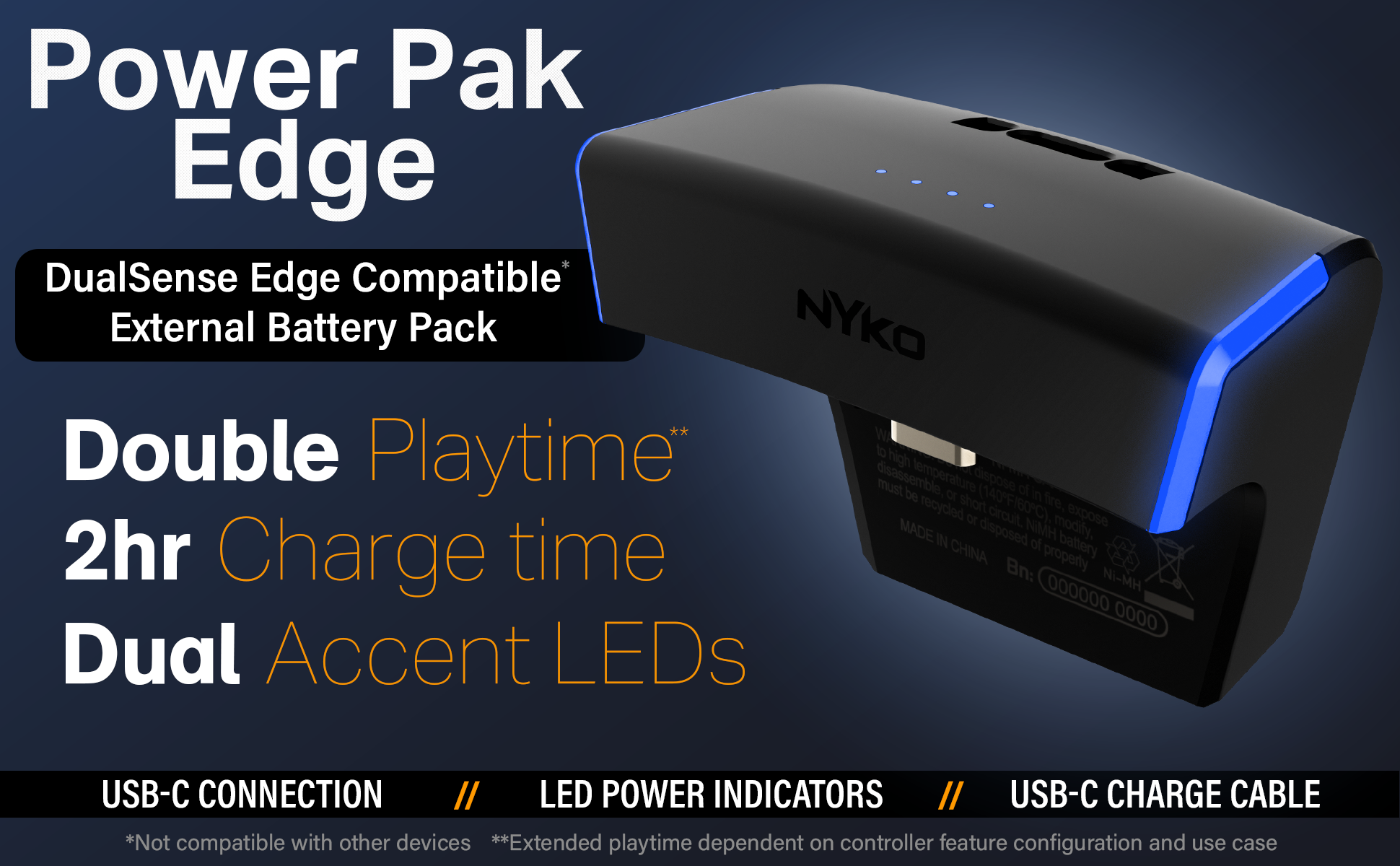 وقت تشغيل ممتد - تتميز Power Pak Edge ببطارية ضخمة تبلغ 1100 مللي أمبير في الساعة، مما يضاعف بشكل فعال وقت التشغيل اللاسلكي لجهاز DualSense Edge. ابق منغمسًا في لعبتك لجلسات ممتدة دون القلق بشأن انخفاض طاقة البطارية. تعمل Power Pak Edge جنبًا إلى جنب مع البطارية الداخلية لتوفير أقصى قدر من وقت اللعب. غير متوافق مع وحدة التحكم DUALSENSE PS5 القياسية.