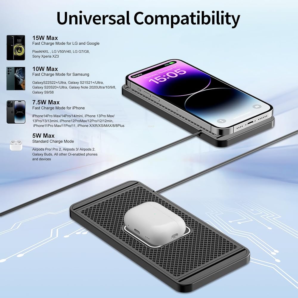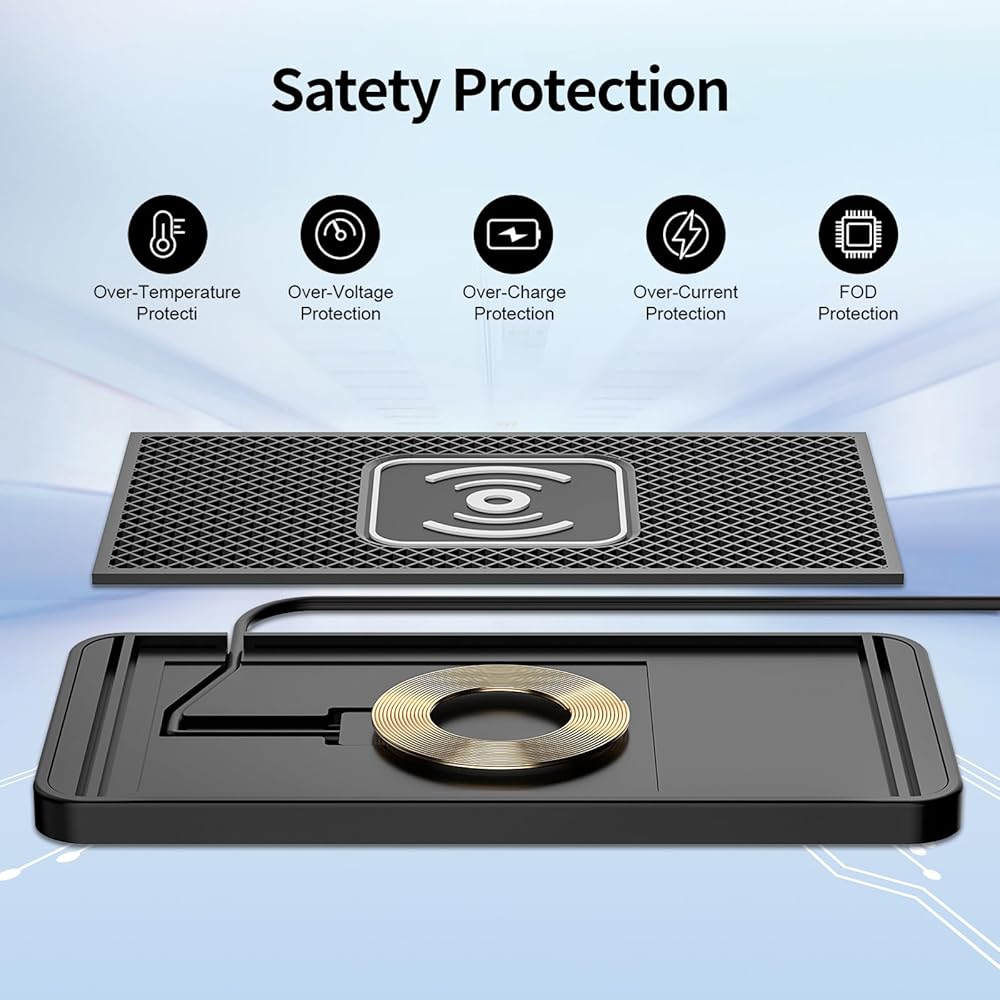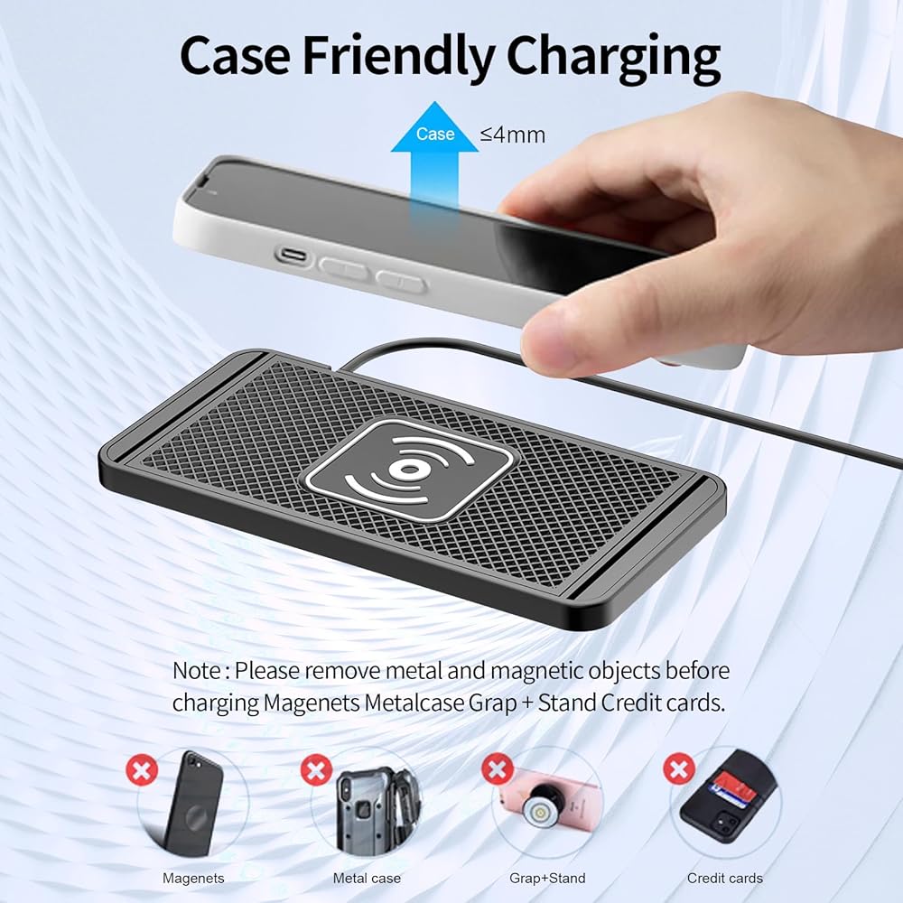 【توافق واسع وغير قابل للانزلاق】تأتي وسادة الشاحن اللاسلكية TTSITG مع سطح وقاعدة مطاطية غير قابلة للانزلاق، وسوف تحافظ على بقاء هاتفك في مكانه بشكل آمن أثناء الشحن. مقاوم للماء، شرق للتنظيف، لا داعي للقلق بشأن سكب الماء في الأعلى. لوحة شاحن السيارة اللاسلكية TTSITG قادرة على الشحن من خلال حافظات يصل سمكها إلى 4 مم. وضع الشحن السريع 15 وات/10 وات/7.5 وات، ستتوافق لوحة الشحن تلقائيًا مع سرعة شحن هاتفك.