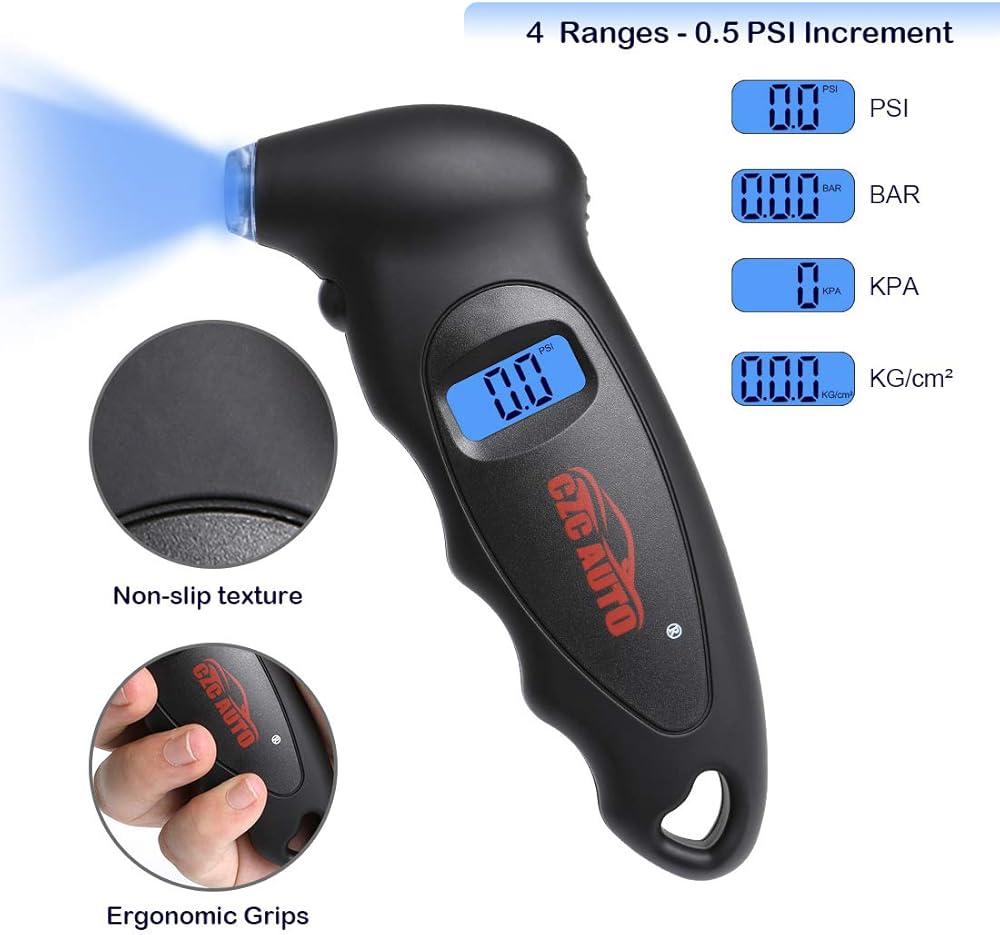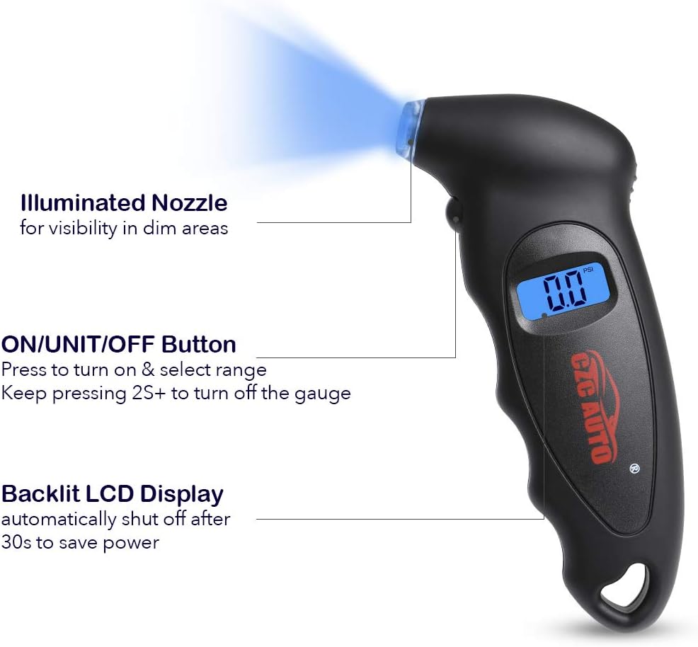 تم تصميم مقياس ضغط الإطارات CZC AUTO من أجل سلامة القيادة. قد يتسبب ضغط الإطارات غير الطبيعي في حدوث ما يلي: انفجار مفاجئ للإطارات، اضطراب في السيارة، مشكلة في الكبح، استهلاك زائد للوقود، وقصر عمر الإطار. للحصول على تجربة قيادة أكثر أمانًا وأفضل، يرجى استخدام جهاز قياس الإطارات لاختبار ضغط العجلات كل أسبوع والحفاظ على ضغط الإطارات في النطاق الطبيعي.