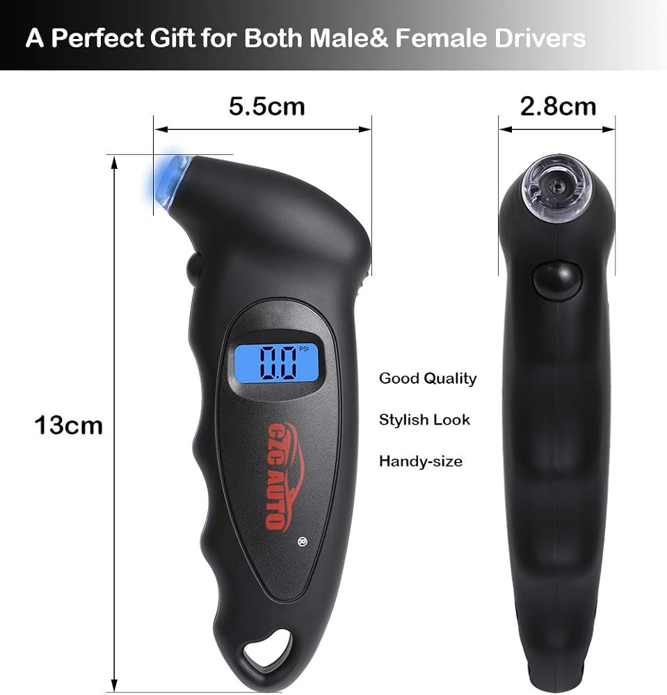 هدية لطيفة للسائقين. اللون الأسود الكلاسيكي ذو الشكل العصري يجعل مقياس الإطار لا يصبح قديمًا أبدًا. جودة جيدة، حجم مناسب (13 × 5.5 × 2.8 سم) يجعل مقياس ضغط الإطارات الرقمي هدية جيدة للسائقين من الذكور والإناث. يا لها من هدية مثالية لنفسك وعائلتك وأصدقائك.