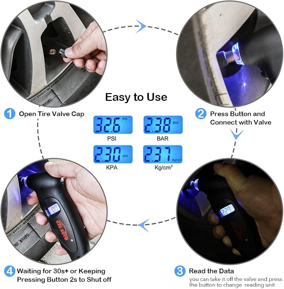 سهل الاستخدام مع 4 نطاقات إعداد: 0-150PSI / 0-10Bar / 0-10Kgf/cm² أو 0-1000KPA. تناسب الفوهة مختلف سيقان الصمامات في السيارات والشاحنات والدراجات النارية والدراجات الهوائية وما إلى ذلك. اضغط على الزر لتشغيل وحدة البيانات وتغييرها، وأغلق ساق الصمام بالفوهة، ثم احصل على قراءات دقيقة بزيادات 0.5 على الشاشة، بدقة ±1 رطل لكل بوصة مربعة. فوهة مضيئة وشاشة LCD بإضاءة خلفية لا تسمح بوجود مشكلة في الاختبار والقراءة في الظلام.