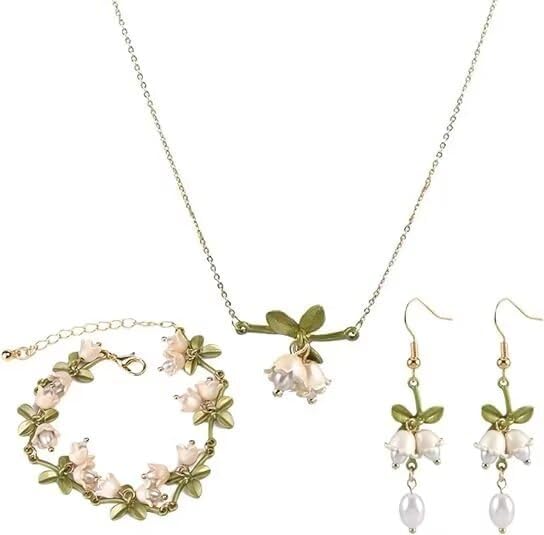 LILY OF THE VALLEY NECKLACE: Elevate your style with this captivating Lily of the Valley Necklace, Flower Leaf Bracelet, and Pearl Valley Lily Dangle Earrings set. Each piece features delicate floral and leaf motifs inspired by nature's beauty.
