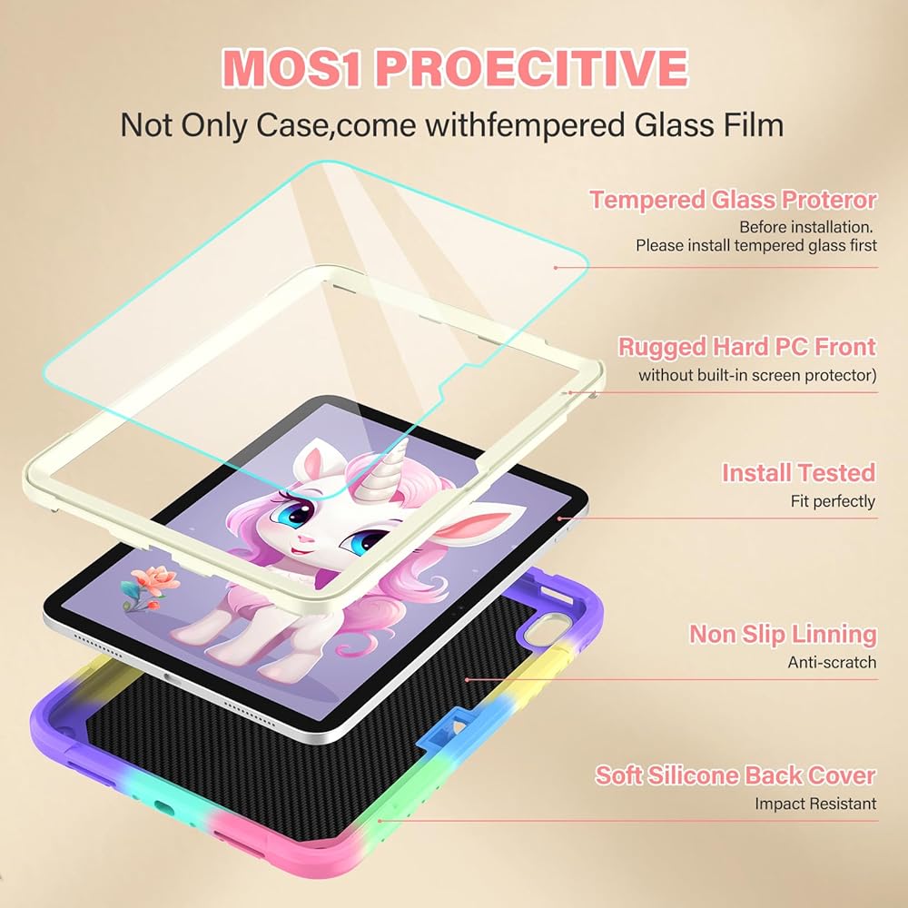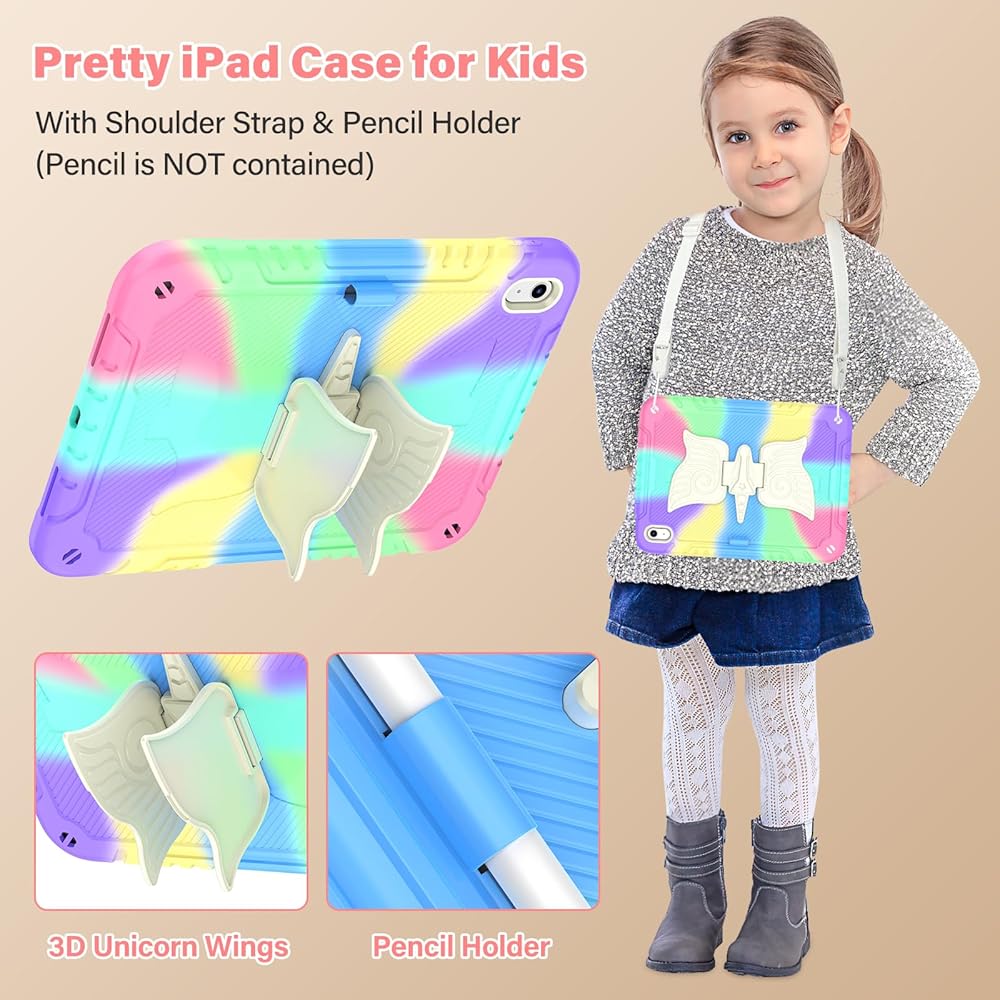 حافظة لجهاز iPad الجيل العاشر مقاس 10.9 بوصة 2022 مع واقي شاشة من الزجاج المقوى، وحامل يونيكورن وحزام كتف حامل قلم رصاص، مقاوم للصدمات لجهاز iPad الجيل العاشر للأطفال البنات (ملون)