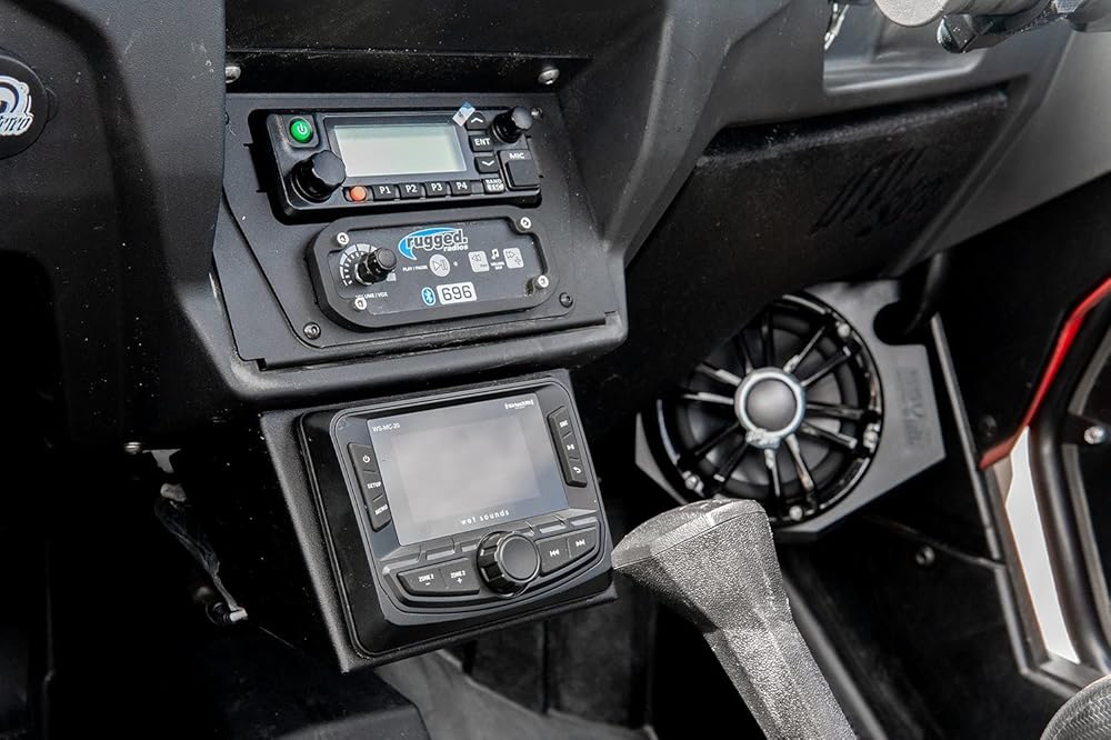 We've finally engineered a source unit mount perfect for installing a source unit underneath the center glovebox. This mount is perfect if you have a Rugged Radio installed in the center glovebox pocket. This powder coated aluminum mount is durable and will withstand all weather conditions. This mount will fit the head units listed: Wet Sounds WS-MC2, JVC KD-MR1BTS, Rockford PMX2, and Rockford PMX3, or just about any gauge style source unit that can mount into a 3.2" or smaller hole.