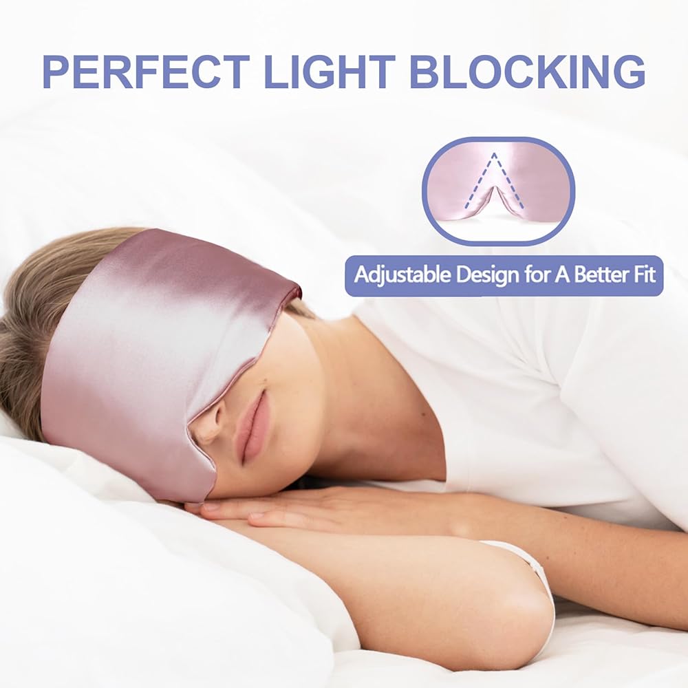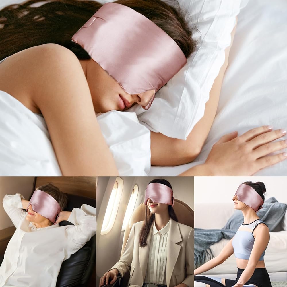 قناع النوم الحريري، يتميز بتصميم واسع الوجه وتقنية متقدمة لحجب الضوء، ويحجب الضوء الساطع ويقلل الضوضاء. تصميم جناح مثلث قابل للتعديل يضمن ملاءمة مريحة دون السماح بدخول أي ضوء، حتى أثناء النهار.
