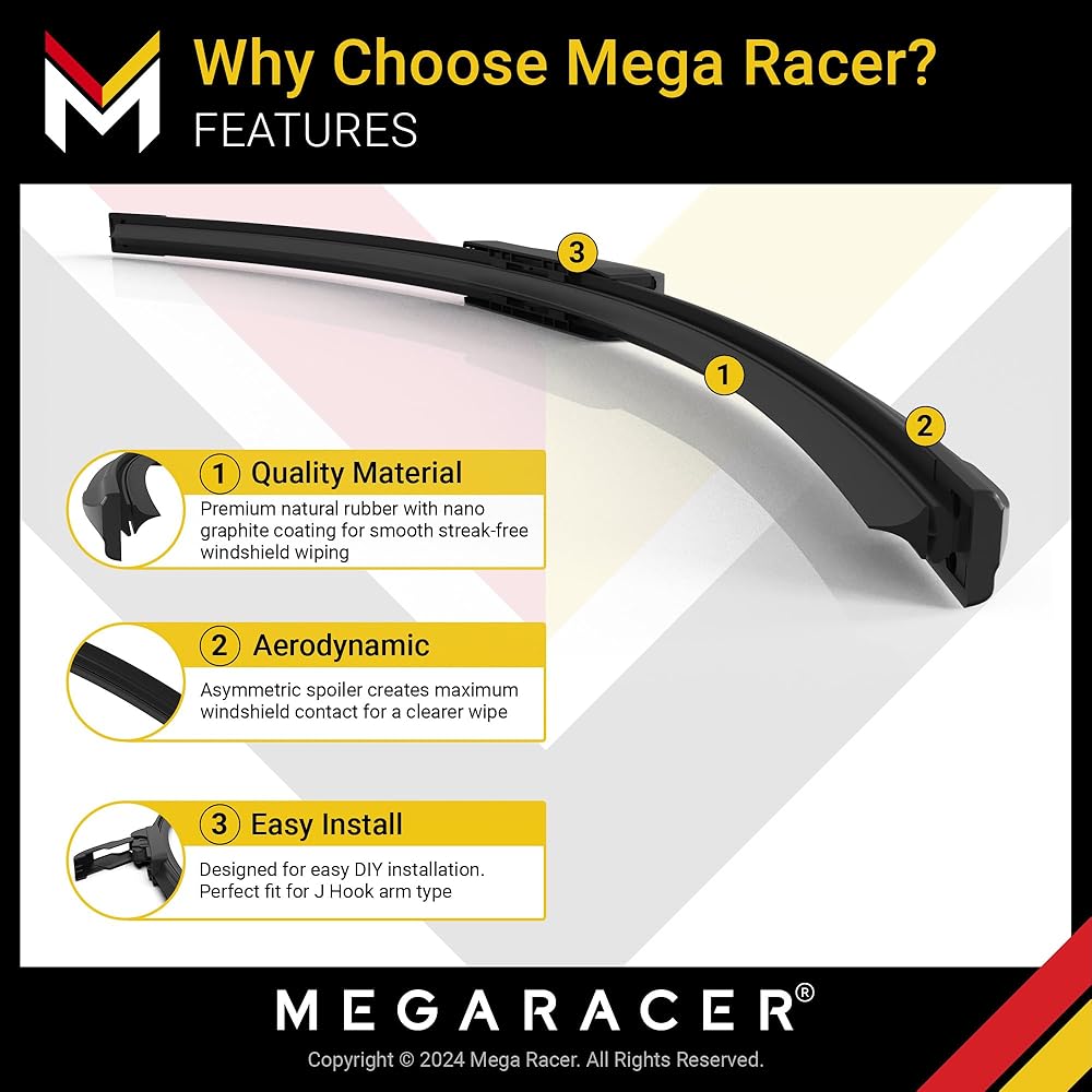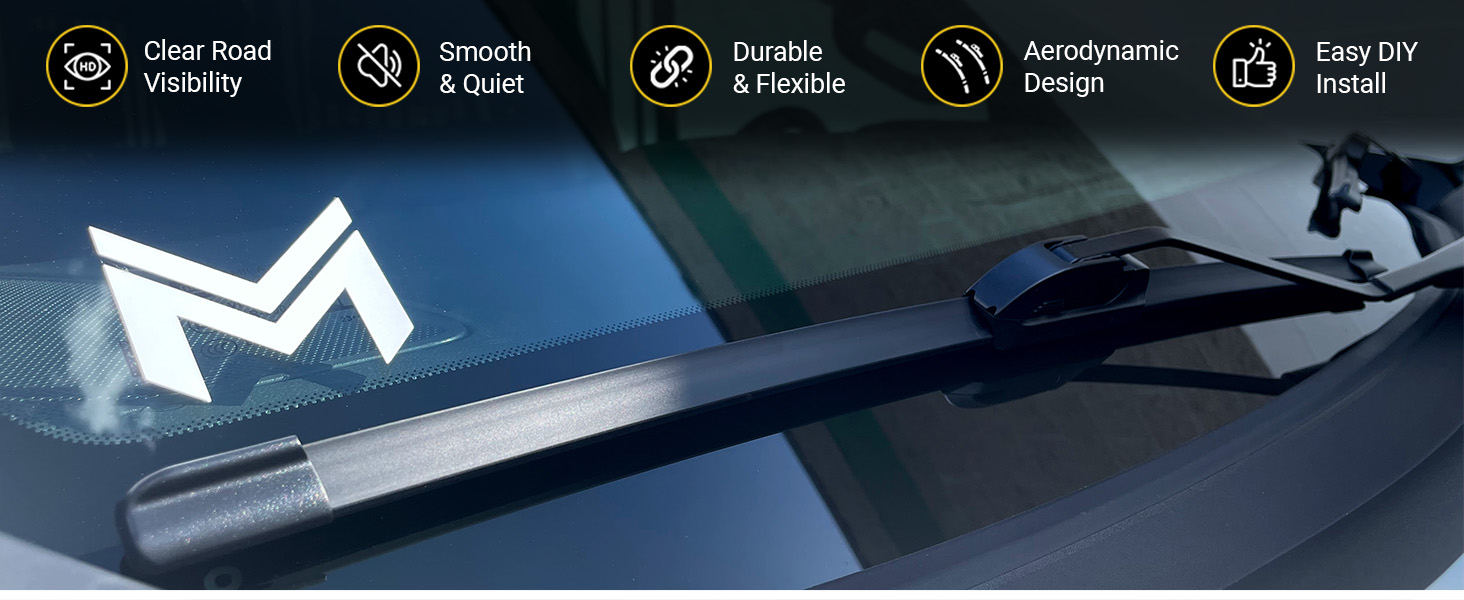 🔆 مادة OEM فاخرة - مطاط طبيعي عالي الجودة مطلي بجرافيت نانو ليمنحك مسحًا سلسًا للزجاج الأمامي خاليًا من الخطوط. مادة فولاذية SK5 على قاعدة التركيب للتوصيل الصلب من محول POM المقطوع بدقة إلى حامل الزجاج الأمامي لسيارتك.