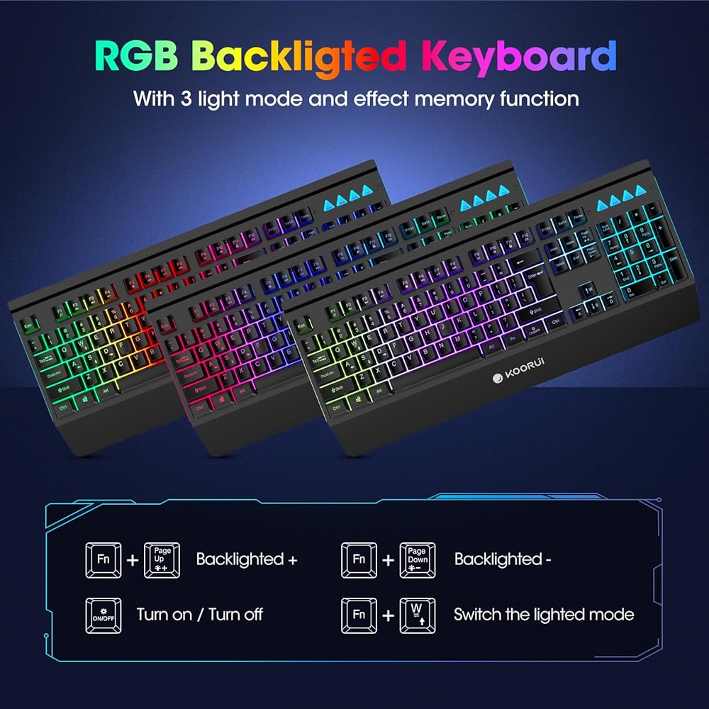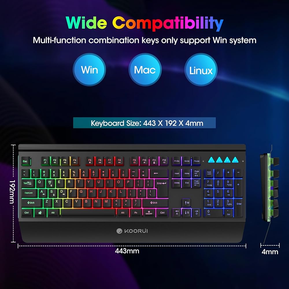 🎁إضاءة خلفية ملونة رائعة - تحتوي لوحة مفاتيح الألعاب السوداء هذه على ثلاثة ألوان من الإضاءة الخلفية، انقر فوق "تشغيل/إيقاف" لتشغيل/إيقاف/تغيير الألوان؛ اضغط على FN+ON/OFF لتشغيل وضع التنفس الضحل؛ اضغط على Fn+PgUp/PgDn لضبط السطوع وإضاءة مساحة العمل ومنطقة الألعاب.