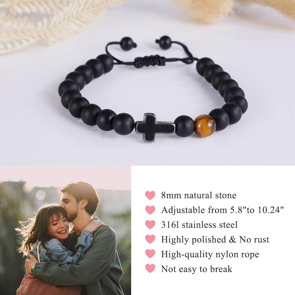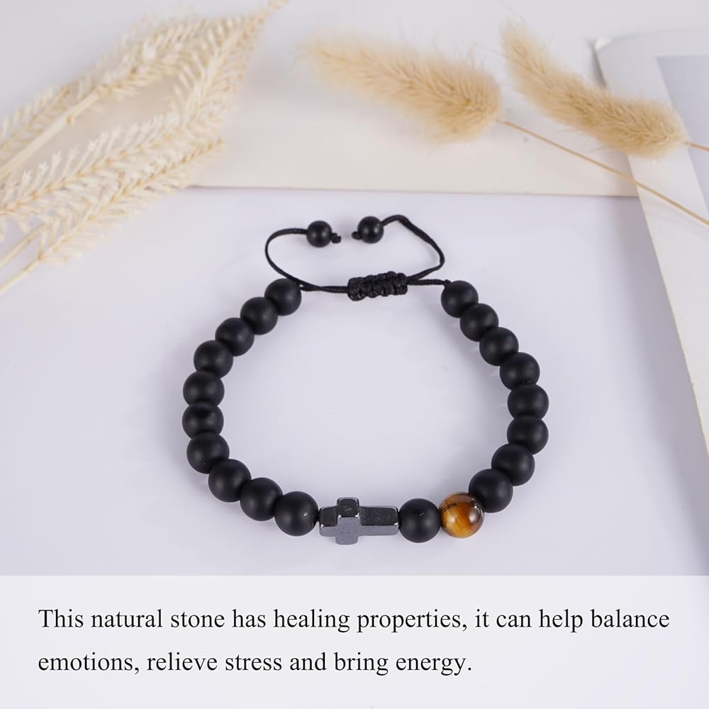 【الخامة: هذا السوار المسيحي مصنوع من حجر عين النمر الطبيعي مقاس 8 مم وحجر العقيق الأسود. مع سحر متقاطع من الفولاذ المقاوم للصدأ، مصقول للغاية، لا يصدأ. هدية تأكيد مثالية للابن وأبناء الأخ.