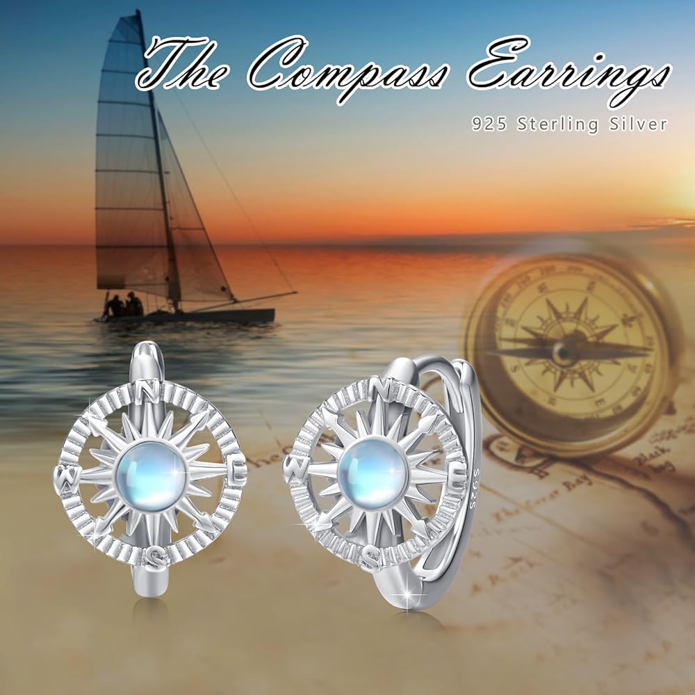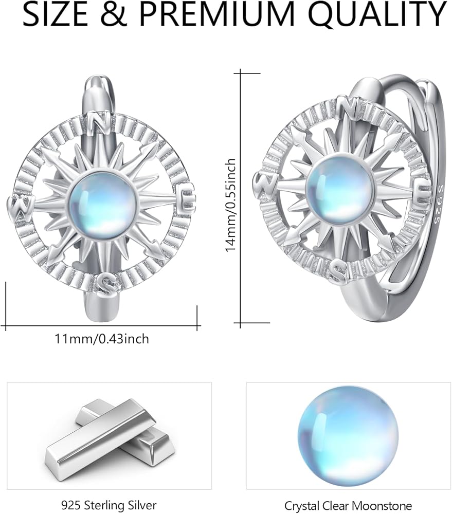 أقراط البوصلة 925 من الفضة الإسترليني Moonstone North Star Huggie هوب أقراط البوصلة البحرية مجوهرات هدية عيد ميلاد للنساء والفتيات