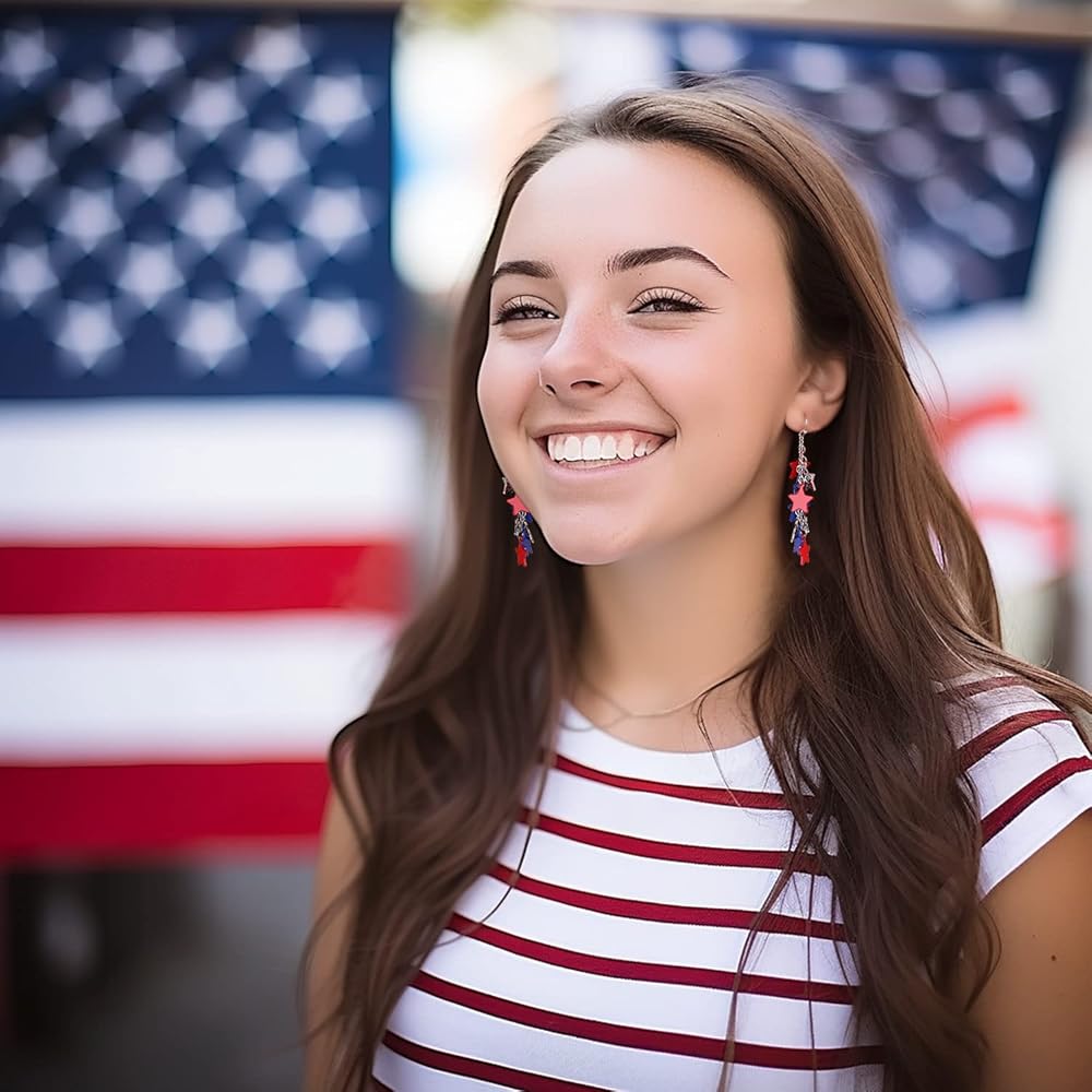 النمط الوطني: احتفل بيوم الاستقلال بأناقة مع هذه الأقراط المتدلية المذهلة التي تتميز بأقراص على شكل نجمة حمراء وبيضاء وزرقاء تتدلى من سلسلة رقيقة.