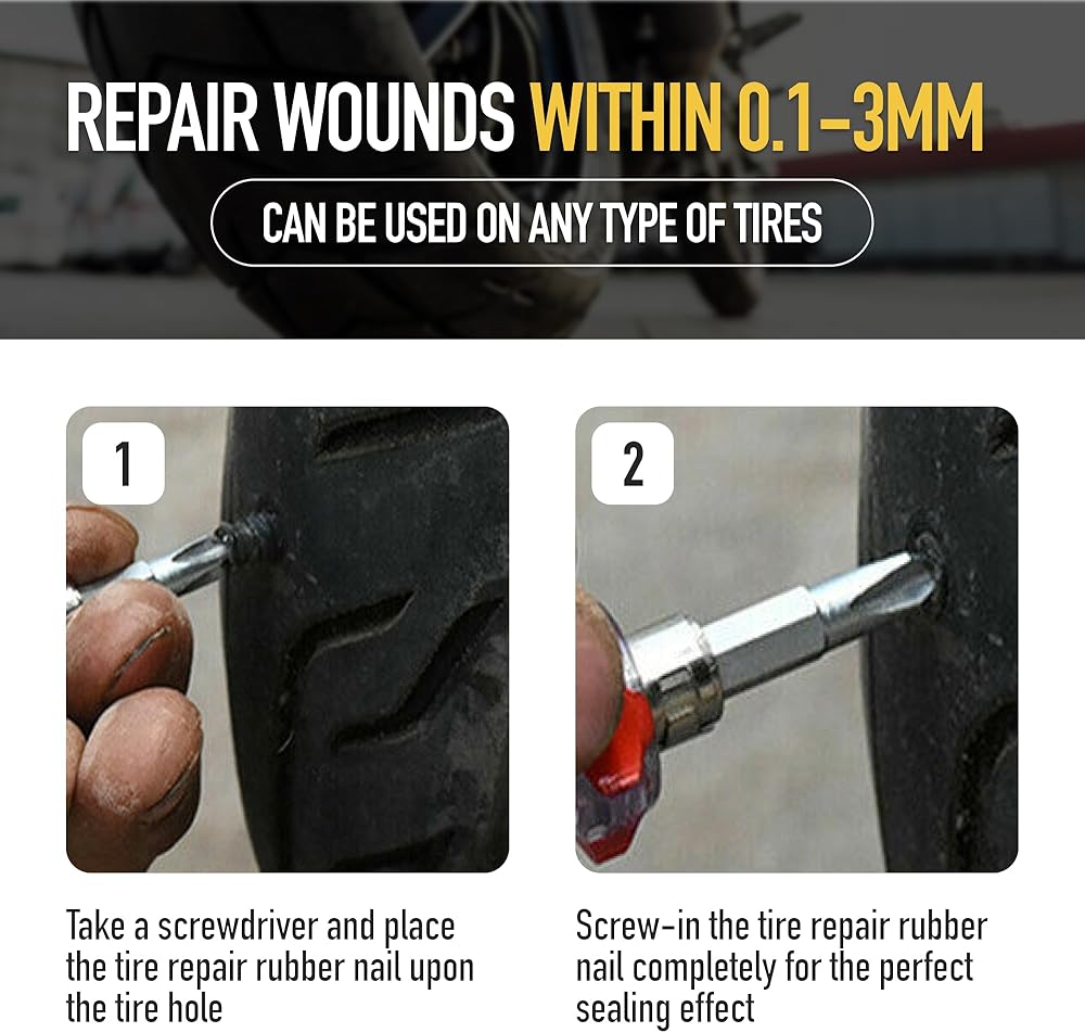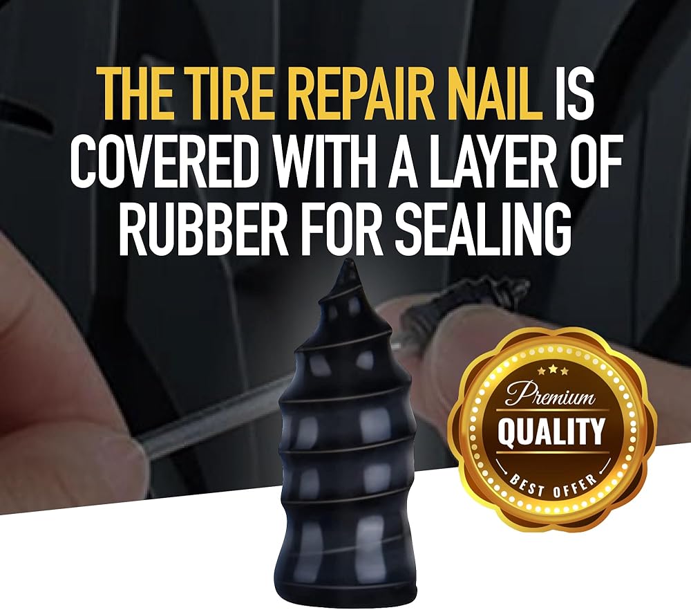 • TIRE REPAIR MADE SIMPLE: Fix a punctured tire in 10 seconds or less. Screw the rubber nail into the tire puncture and you're done. No need to remove the tire!