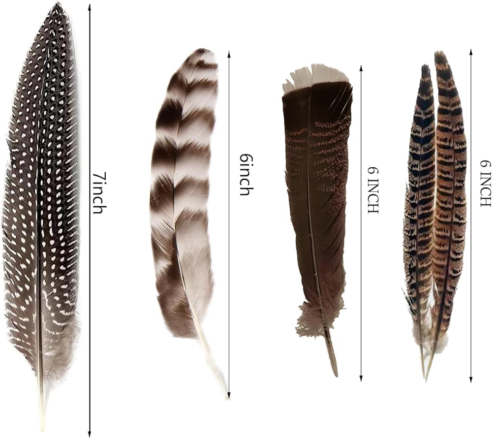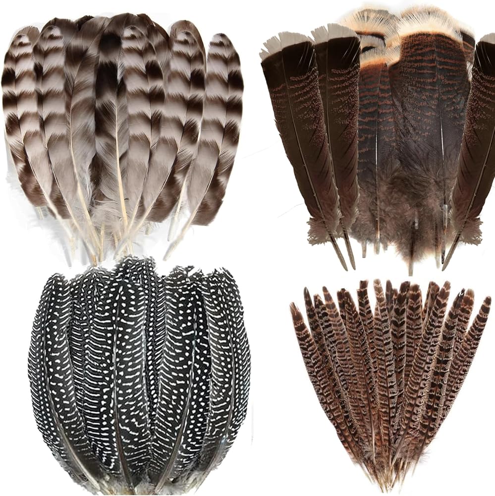 Package Includes: You will receive 40 assorted craft feathers, with a total of four different types of decorative feathers, including 10 pcs guinea fowl wing feathers, 10 pcs reeded chicken feathers,10 pcs pheasant plumage feathers and 10 pcs natural turkey feathers.