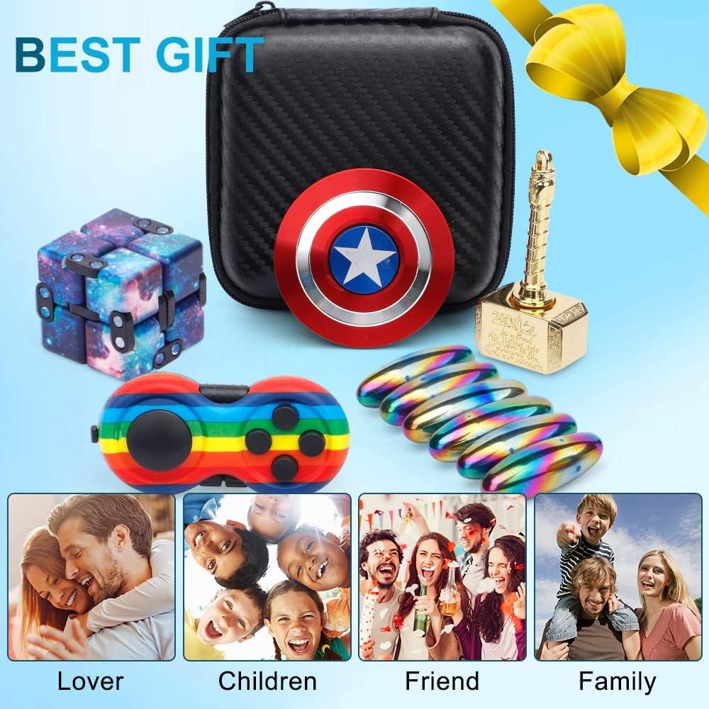 Super Value Pack for Stress Relief: The set includes 1* Shield Spinner, 1* Golden Hammer, 1* Luxury Zipper Case. 1* Fidget Pad, 6* Oval Magnet, 1* Infinity Cube, perfect as Christmas stocking stuffers, are not just toys; they're stress relief tools, designed to keep your hands busy and your mind calm. A thoughtful gift for relaxation and entertainment during the festive season.