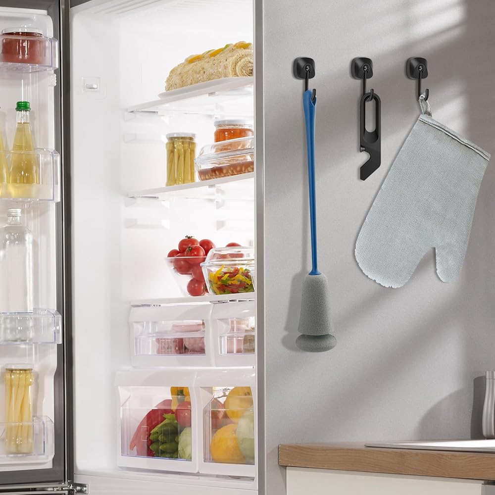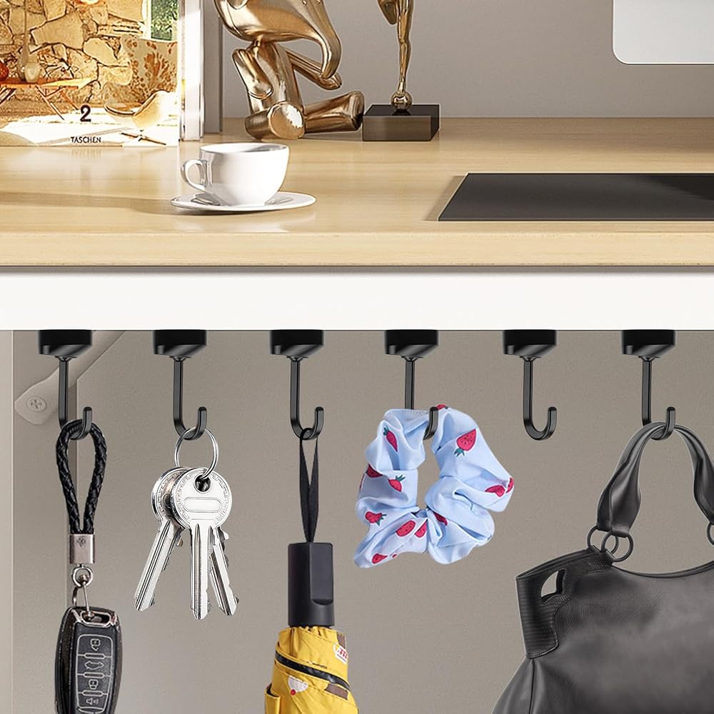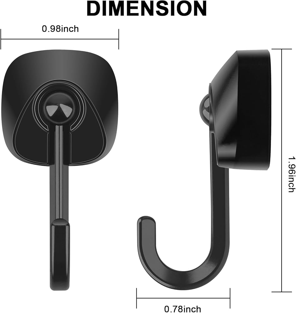 Neodymium magnets and Stainless Steel,allowing you to add storage without drilling holes into wall or using the nails 2. They are ideal for storaging anything from tools to accessories, coat, bag and so on. 3. 6-Pack of metal magnetic hooks are made with Black Coating. 4. You can use the portable hooks to hanger the broom, the aprons, the cup, the pot, the towel, the clothes, utensils,the oven. 5. You can use the Tohoer magnetic hooks on shelves, sink, desk, shed, garden, bars. Place in different locations to hang keys, accessories and so on. WARNING 1.Not for Children 2.Keep away from electronic equipment,such as smartphone,credit card etc. 3.Powerful magnets could hurt your fingers.Please wear a pair of gloves to handle them for your safety. 4.The Maximum Working temperature of neodymium magnets is 176 F (80 C)