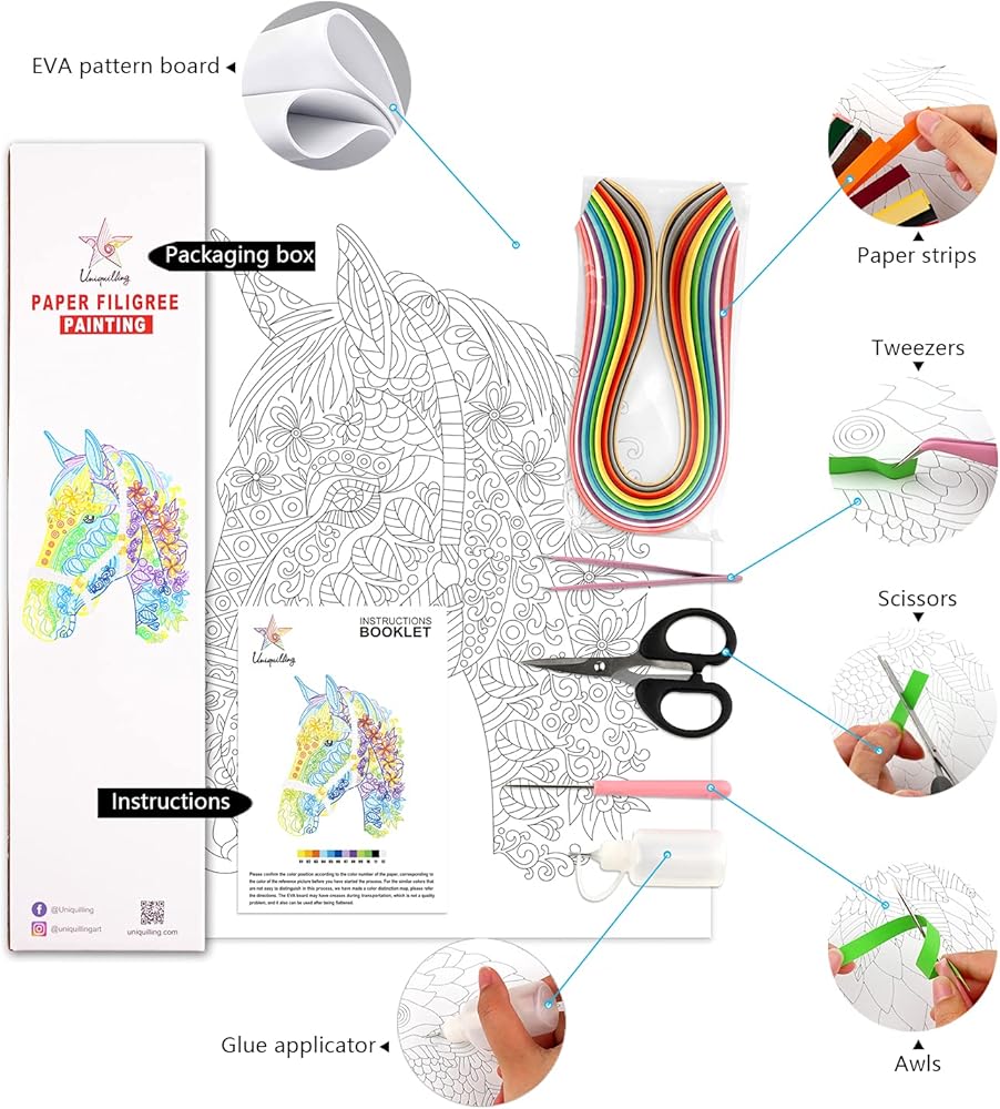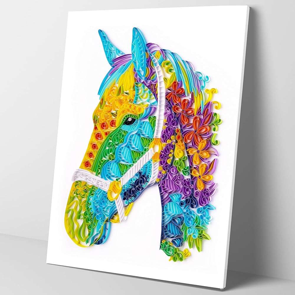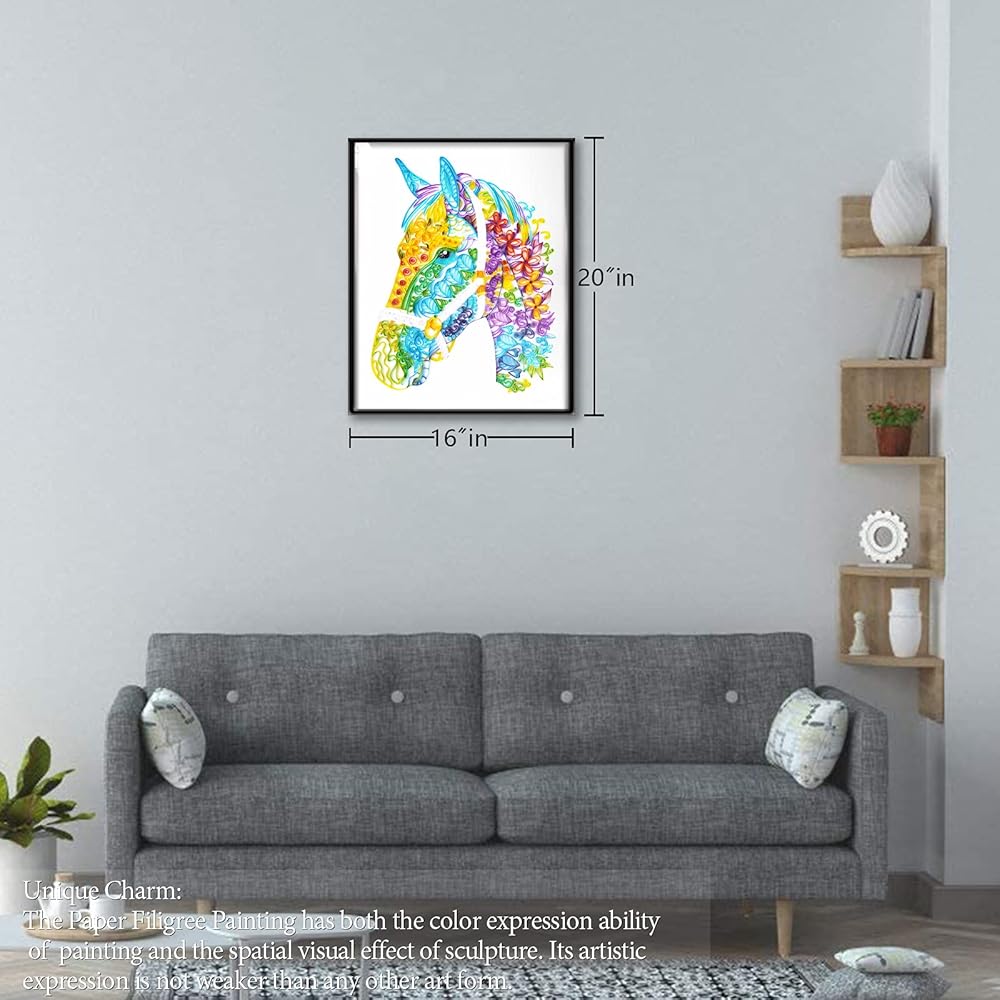 مجموعات لف الطلاء المخرمة الورقية من Uniquilling، لوحة بالأرقام للبالغين - الحصان، أفضل الهدايا لتزيين الحائط يدويًا (مجموعة الرسم + مجموعة الأدوات) (أساسي)