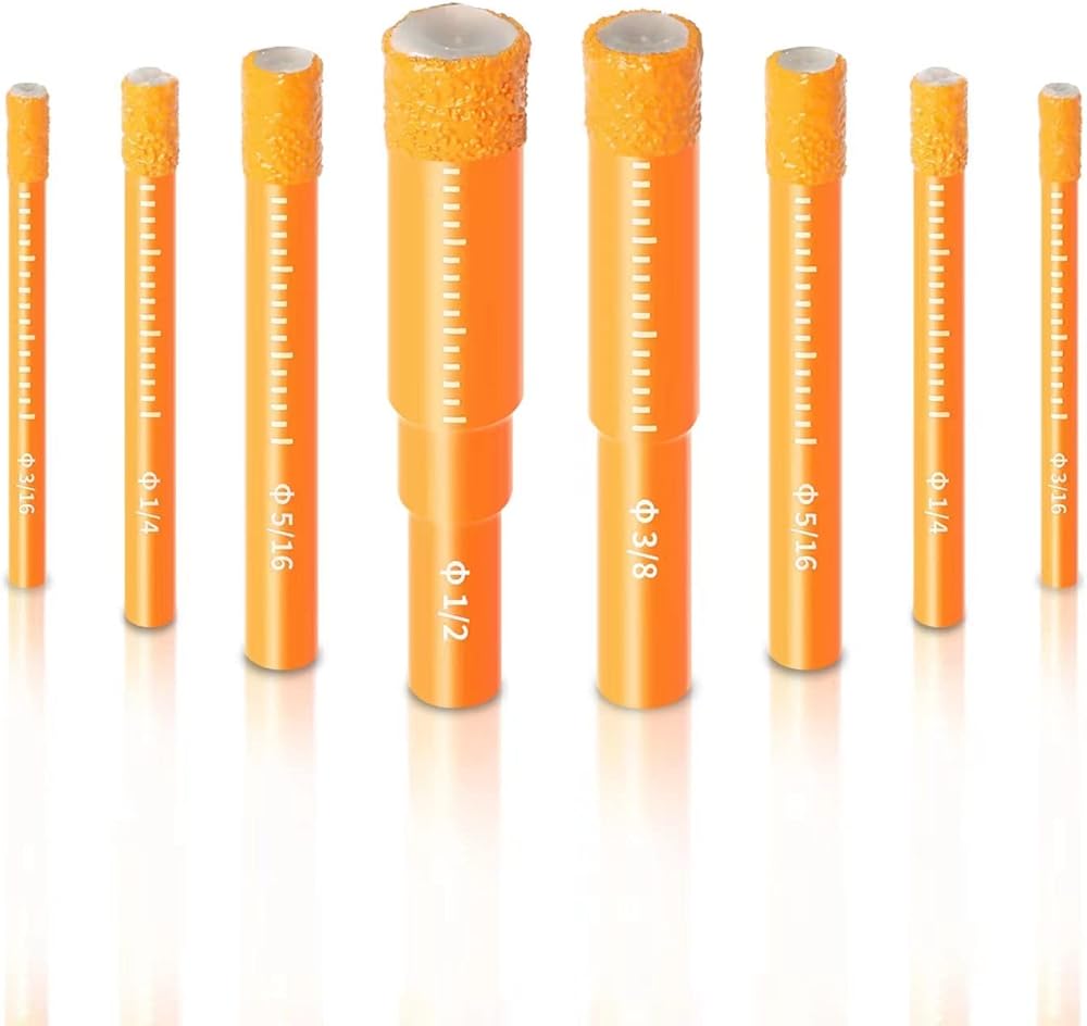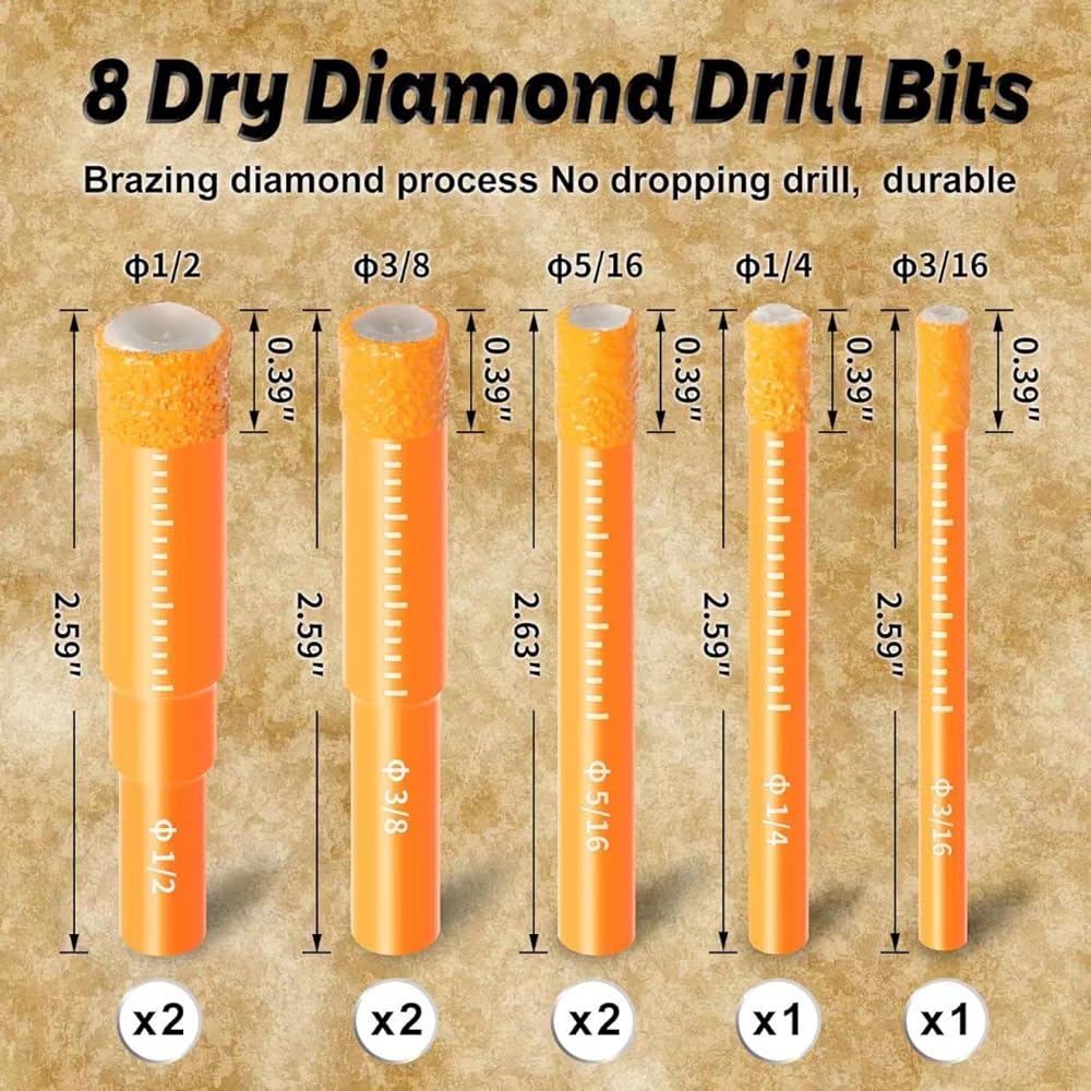 • Package: Storage Case 8 Pieces of Dry Diamond Core Drill Bits Kit for drilling holes diameter: 2 pieces of 3/16” (5mm), 2 pieces of 1/4” (6mm), 2 pieces of 5/16” (8mm), 1 piece of 3/8” (10mm) and 1 piece of 1/2” (12mm)