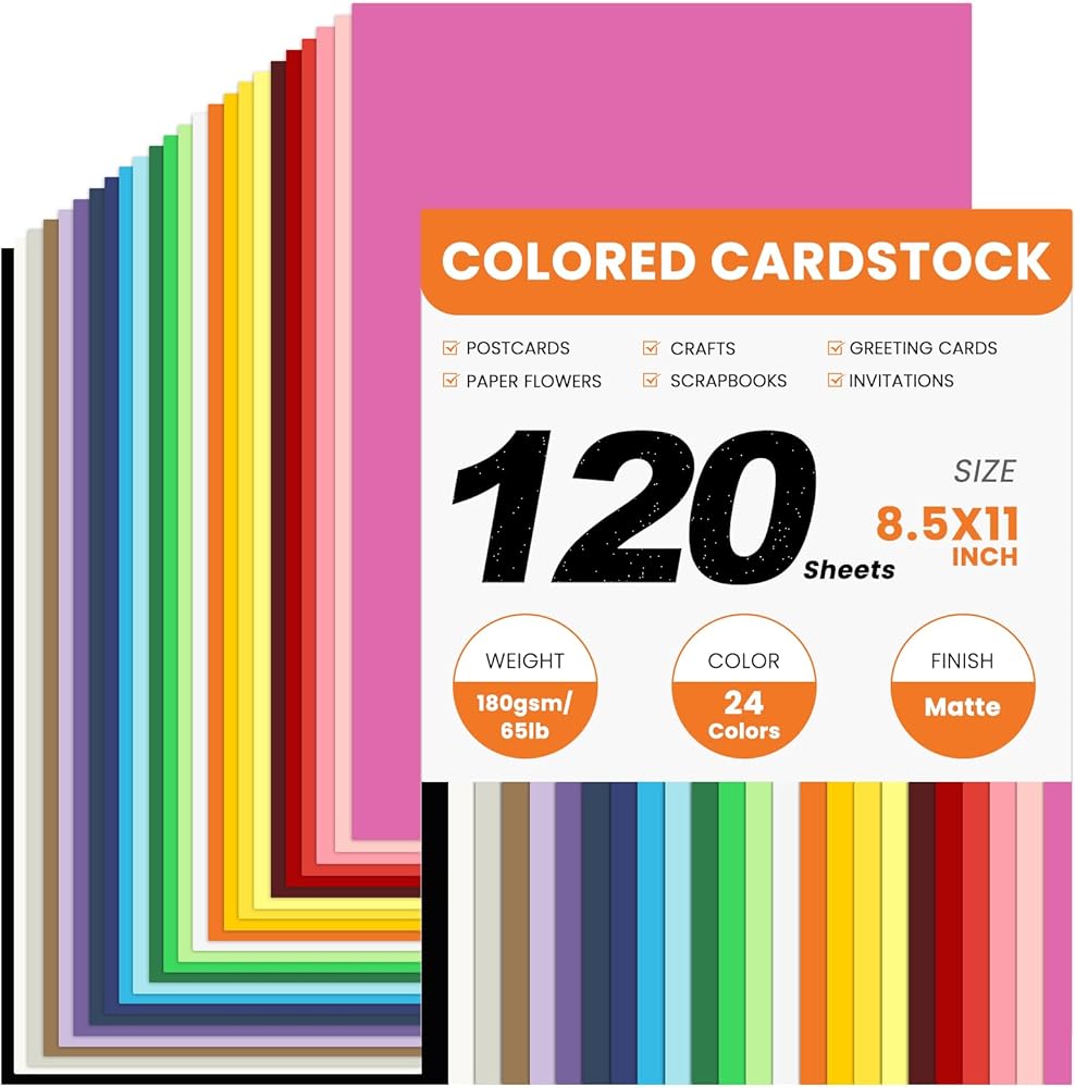 120 ورقة بطاقات ملونة، 180 جرامًا للمتر المربع/65 رطلًا، ورق طباعة بطاقات 24 لونًا مقاس 8.5 × 11 بوصة، ورق بطاقات مطبوع مزدوج الجوانب للأطفال، طباعة قصاصات مكتب المدرسة، أعمال يدوية يدوية