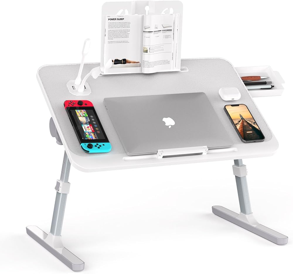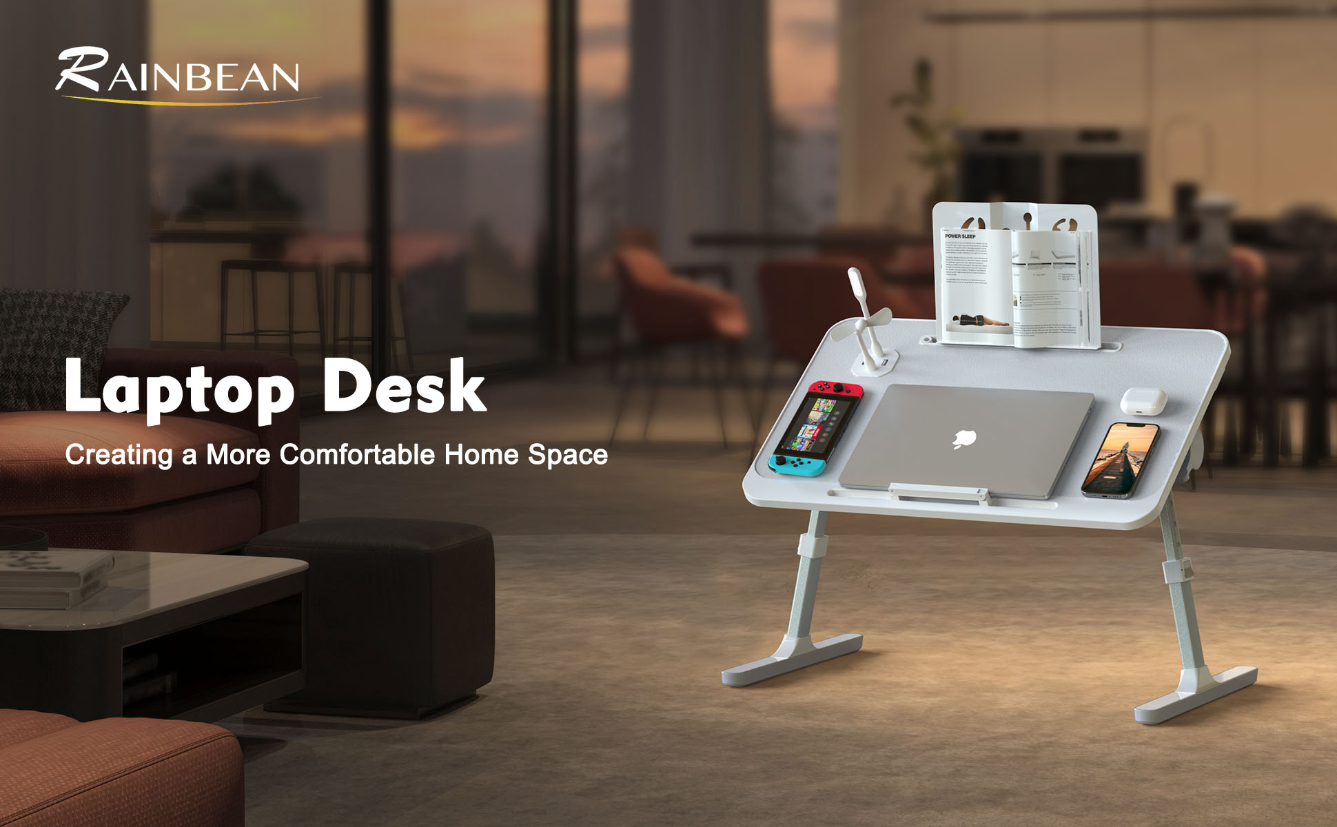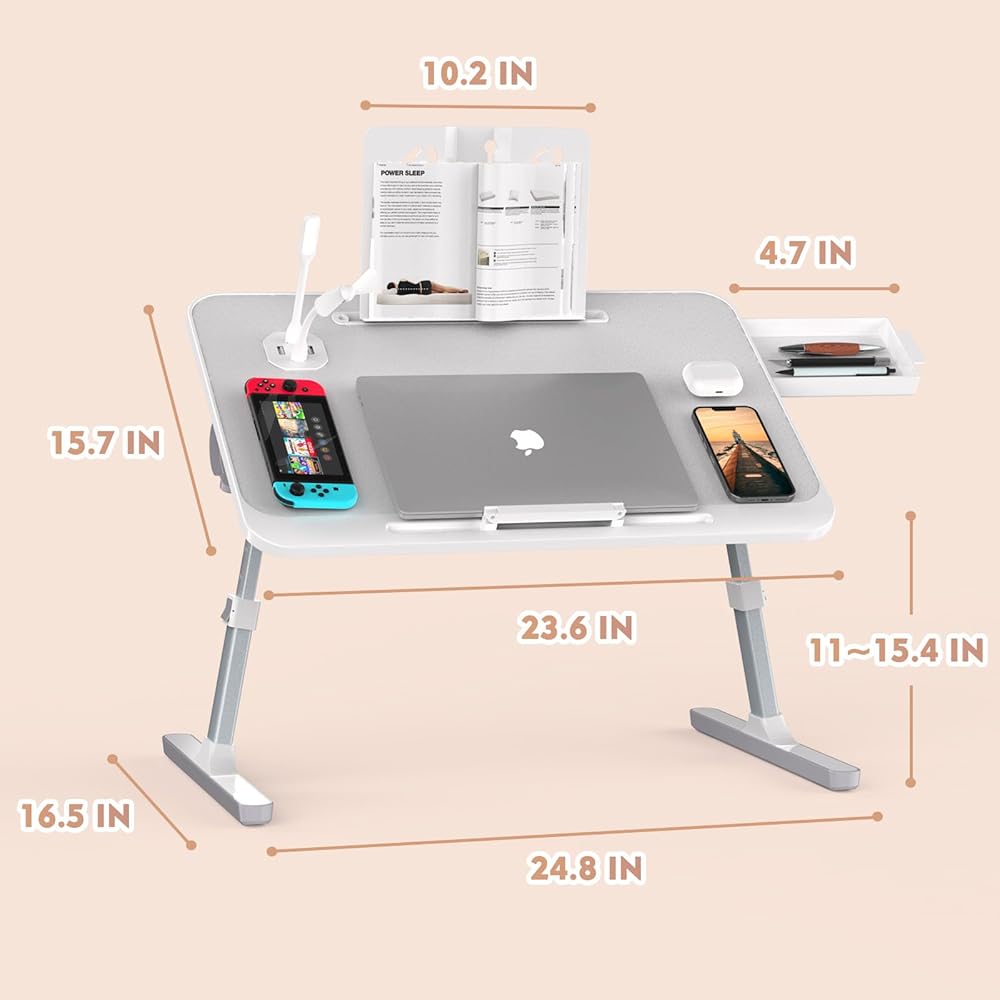 مكتب كمبيوتر محمول من RAINBEAN مع منفذ شحن وحامل كتب، مكتب كمبيوتر محمول قابل للطي وقابل للتعديل للسرير والأريكة