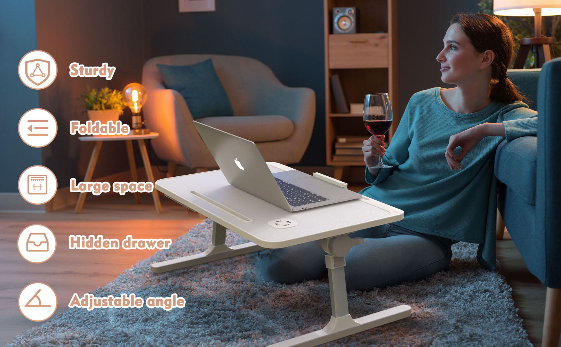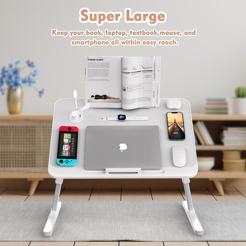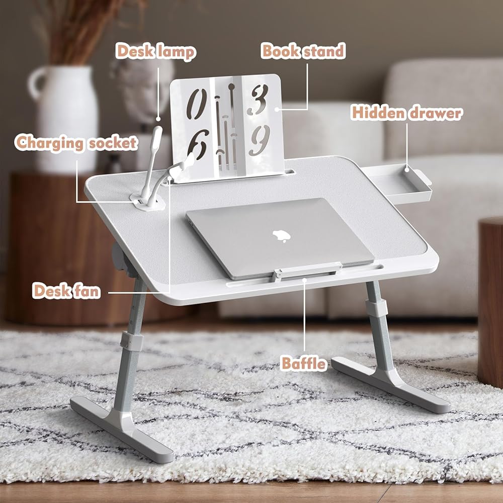 مكتب كمبيوتر محمول من RAINBEAN مع منفذ شحن وحامل كتب، مكتب كمبيوتر محمول قابل للطي وقابل للتعديل للسرير والأريكة