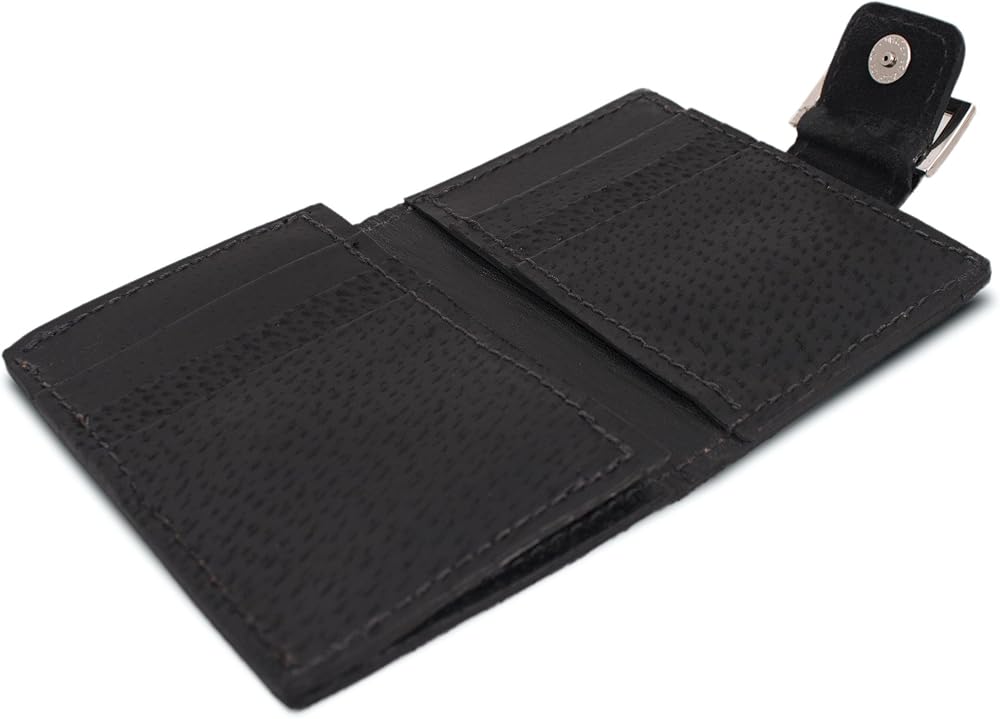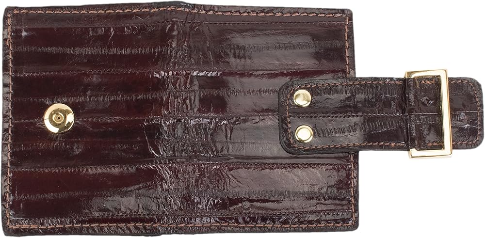 This wallet is made with Genuine Pacific Eel Skin leather. It has 6 wide credit card slots. One side is a coin pouch and the other side is an additional pocket. A strap with a magnetic snap holds the wallet closed.