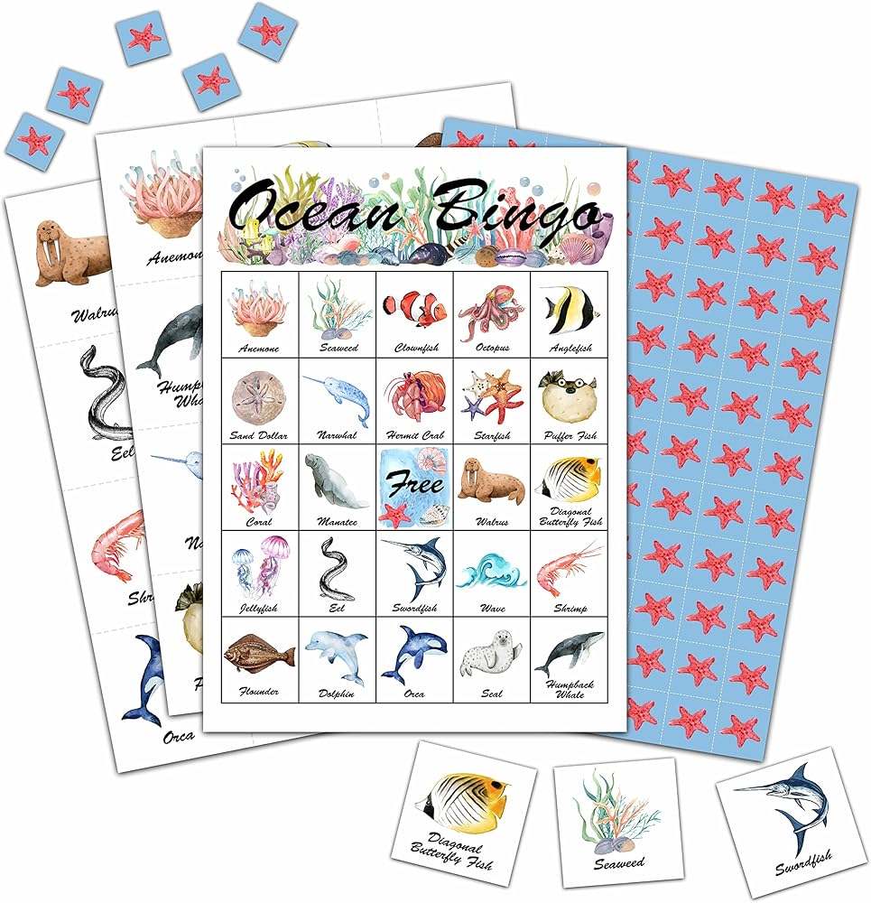 بطاقات أوشن بينجو، مجموعة ألعاب بينجو لحيوانات المحيط، ديكورات حفلات أعياد الميلاد تحت البحر، أنشطة منزلية للفصول المدرسية - A03