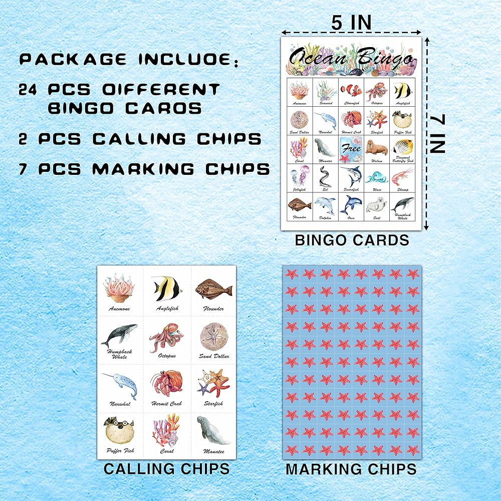 • You Will Receive: 24 bingo cards, 7 marking chips and 2 calling chips. It can accommodate parties of 24 players.