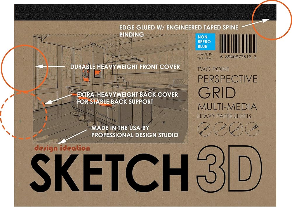 SKETCH PADS: Design Ideation brand SKETCH pads are premium quality sketchpads. Each removable sheet sketchpad is constructed for durability and longevity. The heavy front cover offers project-tough durability. The extra-heavy back cover provides sturdy backing for sketching when extra support is needed. Design Ideation sketchpads are fitted with multi-media sheets that are suitable for ink, graphite, charcoal, marker and watercolor paints. The exceptionally thick sketching sheets won't bleed through and will stand the test of time. HANDMADE STUDIO BRAND. Every Design Ideation brand SKETCH book is made individually by hand in the USA. All cutting, punching, sorting, and assembly are completed with manual processes. No automation is used in the making of the sketchbooks.