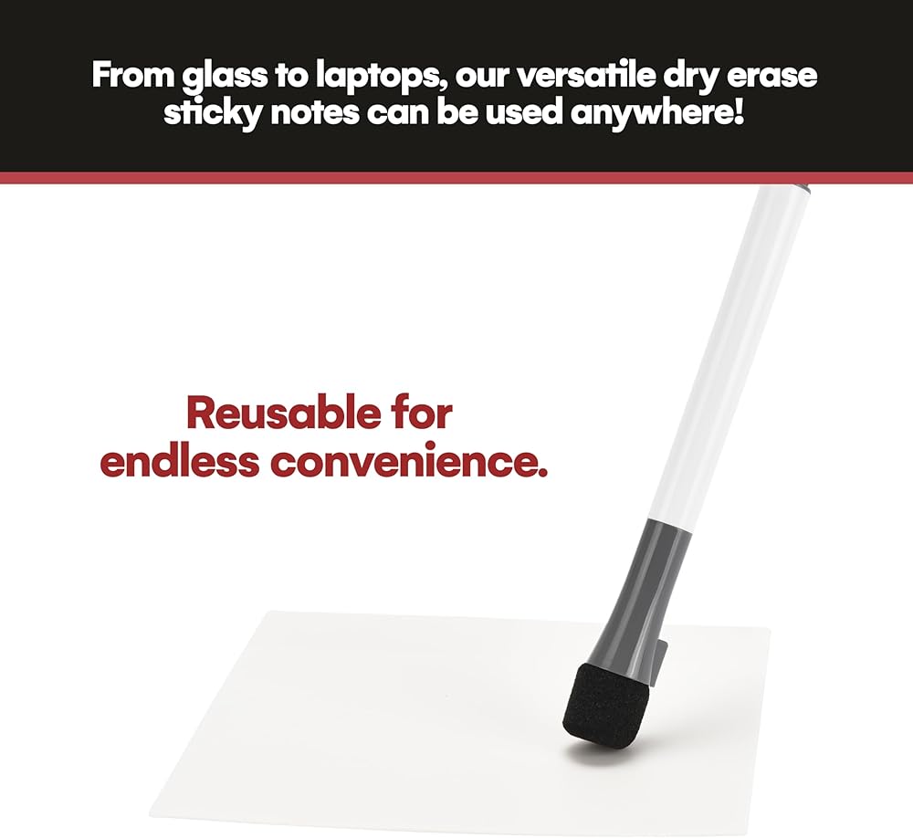 ملاحظات لاصقة للمسح الجاف: دلل نفسك بمرونة المسح الجاف بعد الملاحظات. تضمن هذه الملاحظات، القابلة لإعادة الكتابة والمسح بشكل مذهل، أن تكون رسائلك واضحة ومقروءة. نظرًا لأن منشور المسح الجاف يمكن إعادة استخدامه، يمكنك الكتابة والمسح وإعادة الكتابة من الصفر دون عناء. فكر فيها على أنها لوحة بيضاء لاصقة تزين بها حائطك أو مساحات عملك
