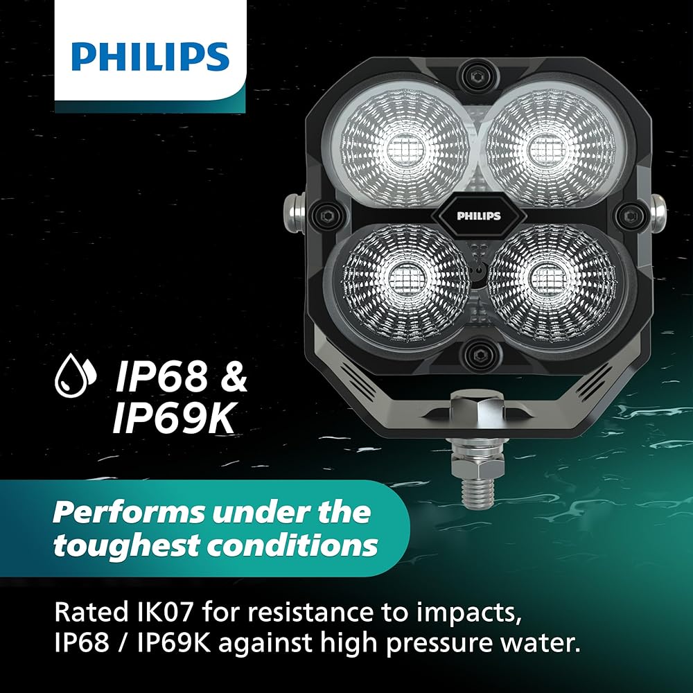 Brilliant LED Lighting for Thrilling Off-Road Adventures For drivers who demand the maximum of themselves and their machines, we offer Philips Ultinon Drive 5000 series LED Lightbars and pod lights. Exceptionally rugged, with unsurpassed illumination and beam focus, these lights will help lead the way wherever you want to go. Built for Tough Environments Philips Ultinon Drive 5000 series lightbars and pod lights are built to withstand the toughest conditions. Combined with excellent heat management, the designs provide consistent high light output throughout your journey. They also have an impact protection rating of IK07, to ensure it can withstand the hazards of aggressive off-roading. Rugged polycarbonate lenses resist damage and scratches. Thick stainless steel brackets and hardware are corrosion resistant and able to withstand heavy vibrations. Robust DT Connectors provide a plug and play waterproof electrical connection. They are all waterproof rated IP68 and IP69K. This means they are resistant to the ingress of fine dust particles as well as high temperature and high pressure water blasts. These lights will perform, wherever your road leads and whatever the weather. They will be more than a match for any power washer you use to clean your ride after your adventures. Compatible with: POWERSPORTS AND OFF ROAD ENTHUSIAST VEHICLES: Trucks, SUVs, ATVs, UTVs, Side by Sides, 4x4s, Dirt Bikes, Snowmobile, Boats, RVs WORK EQUIPMENT: Tractor, Excavators, Tow Trucks, Snow Plows, Heavy Duty Trucks, Construction, Landscaping