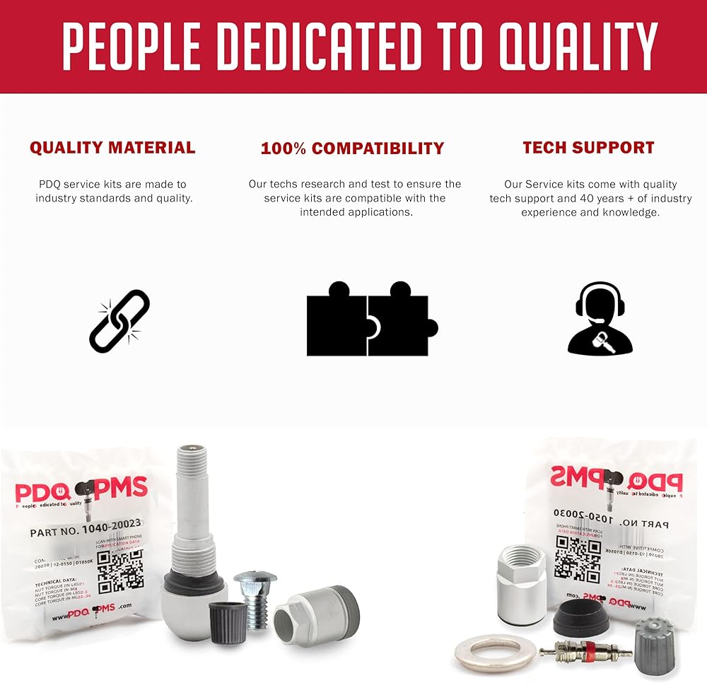 PDQ TPMS Service Kits are manufactured to exacting OE standards to ensure reliable performance and durability, it is constructed of high quality material. Every component has undergone extensive professional testing, to ensure trouble-free installation and excellent performance.