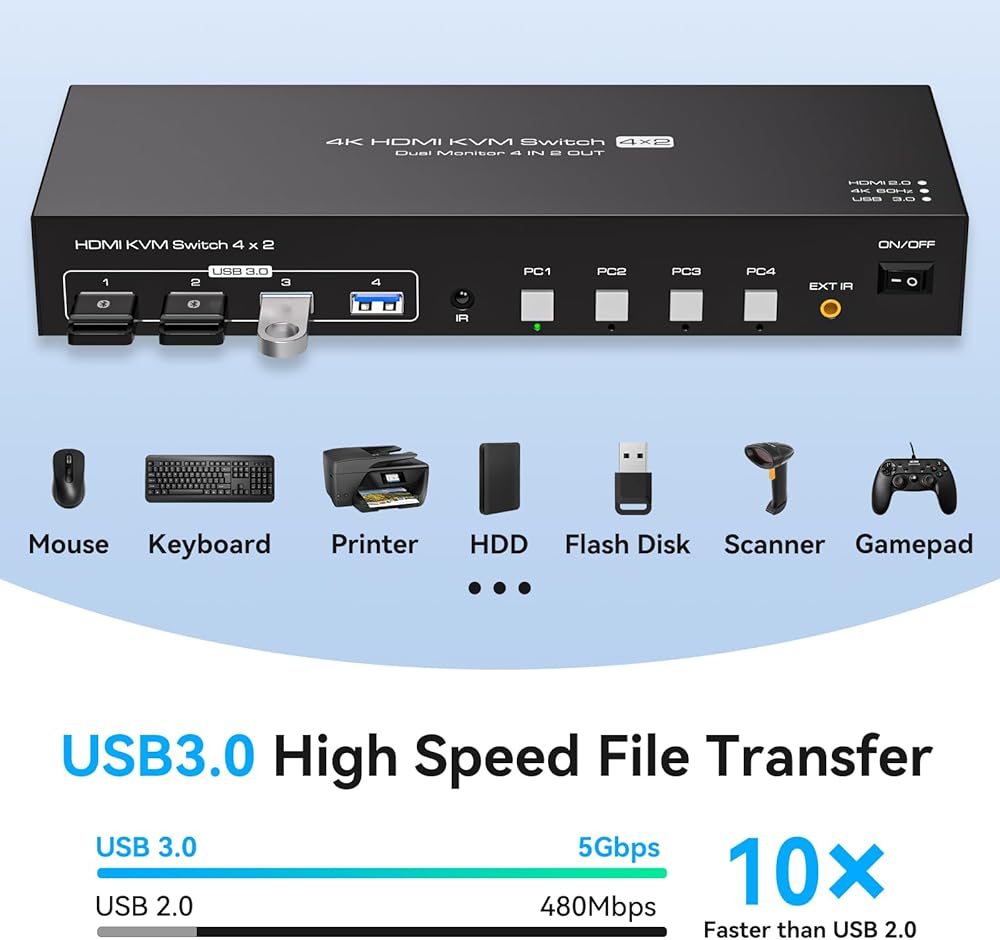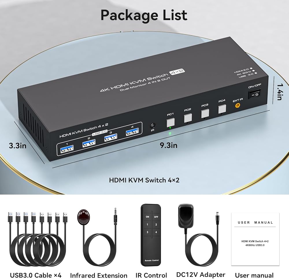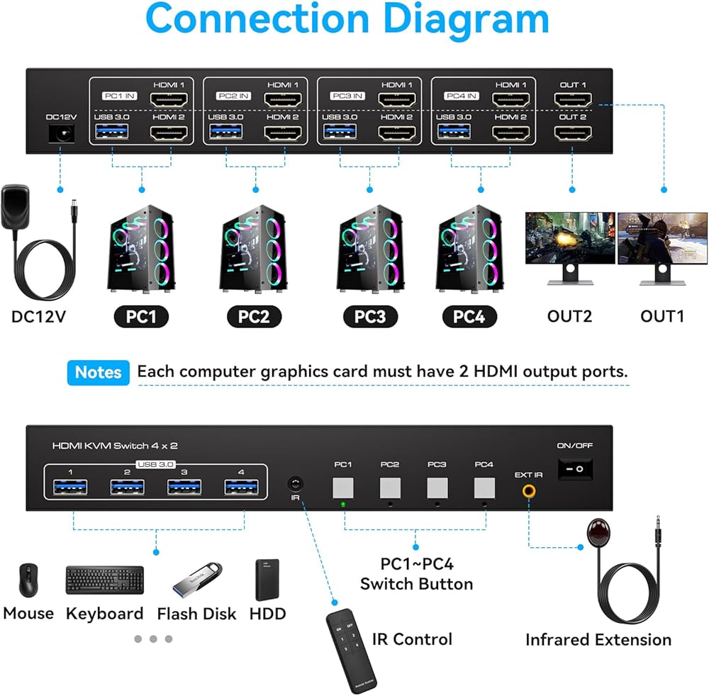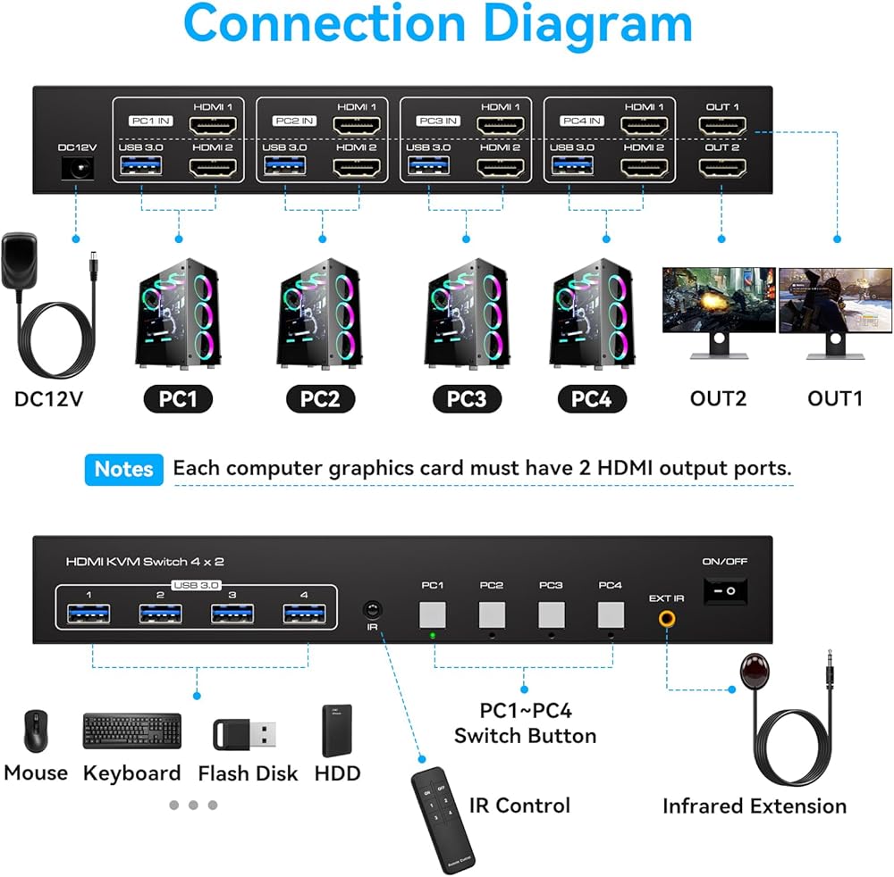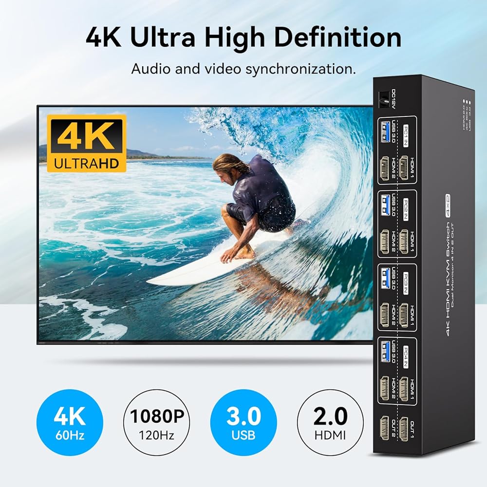 KVM Switch 2 شاشات 4 أجهزة كمبيوتر 4K @ 60HZ HDMI KVM Switches شاشة مزدوجة لمشاركة 4 أجهزة كمبيوتر، شاشتين و4 أجهزة USB3.0 مع أربعة كابلات USB3.0 وجهاز تحكم عن بعد بالأشعة تحت الحمراء